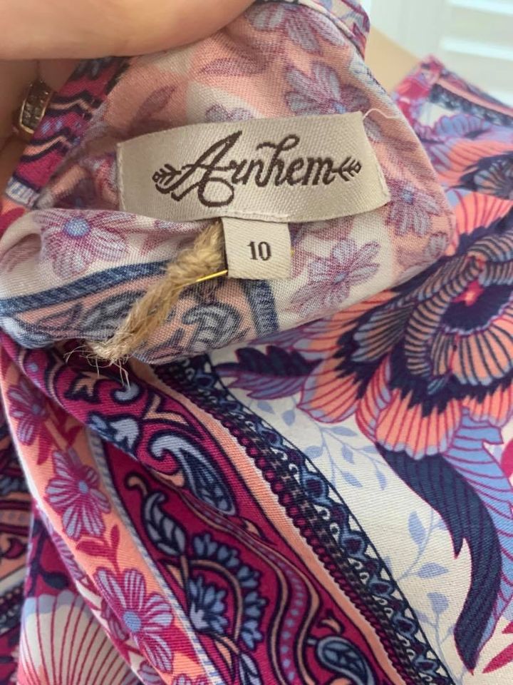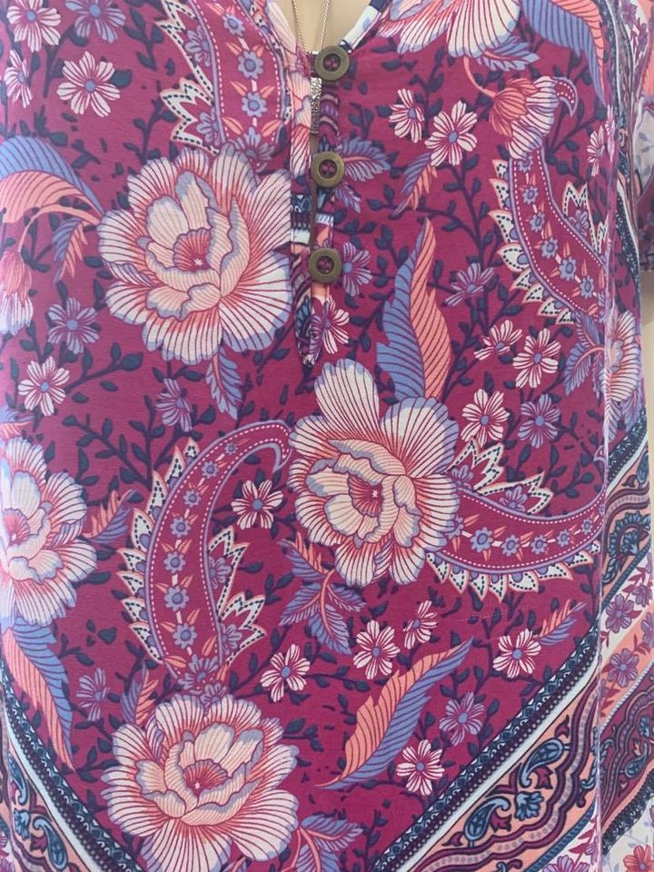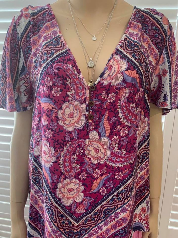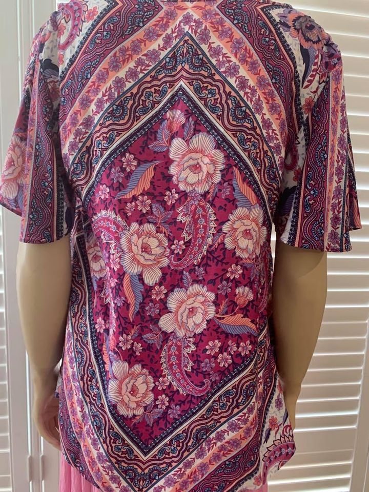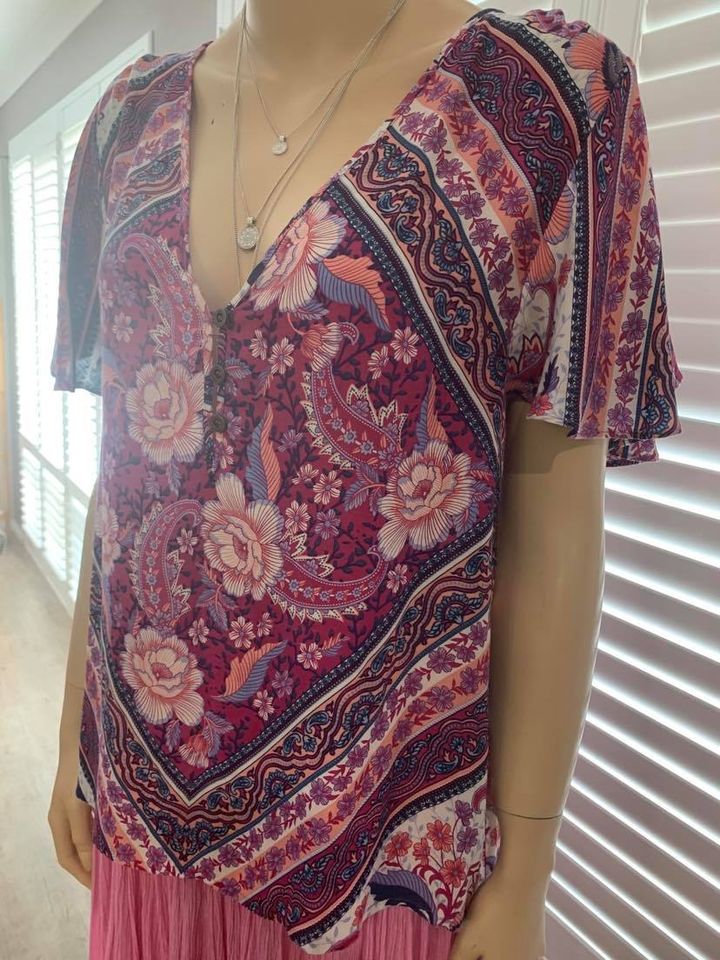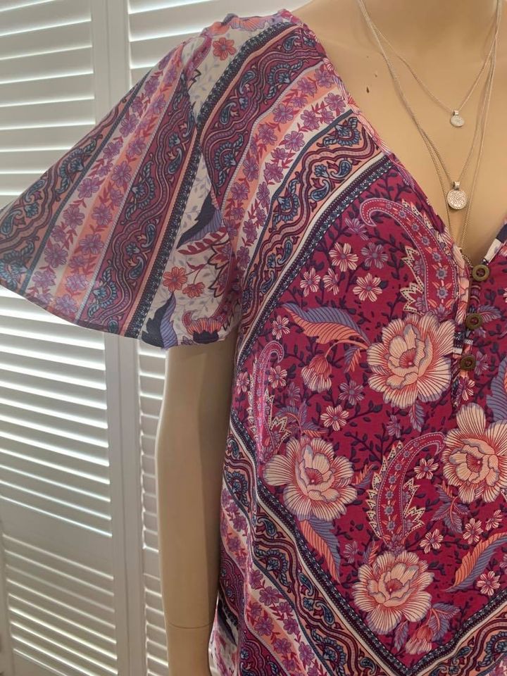 Gorgeous Arnhem short sleeved boho top in lovely colours. Very flattering style, V neck with three buttons at the front. Pretty floaty fluttery sleeves. Top is slightly longer at the back.