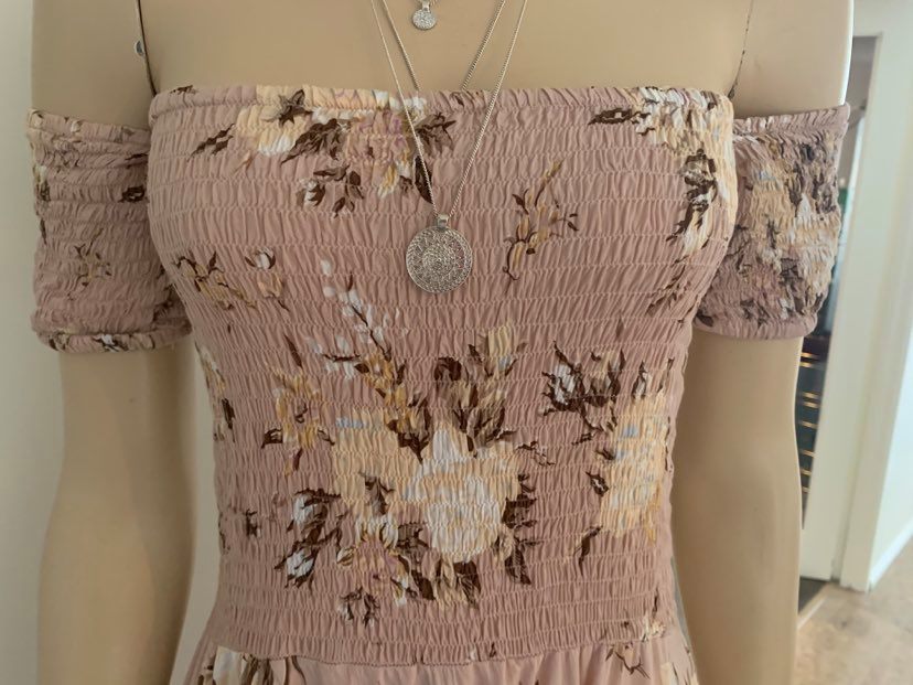 This stunning 'Auguste The Label' dusty rose maxi features a pretty floral print, off the shoulder neckline, shirred bodice and sleeves and a floaty maxi length skirt.