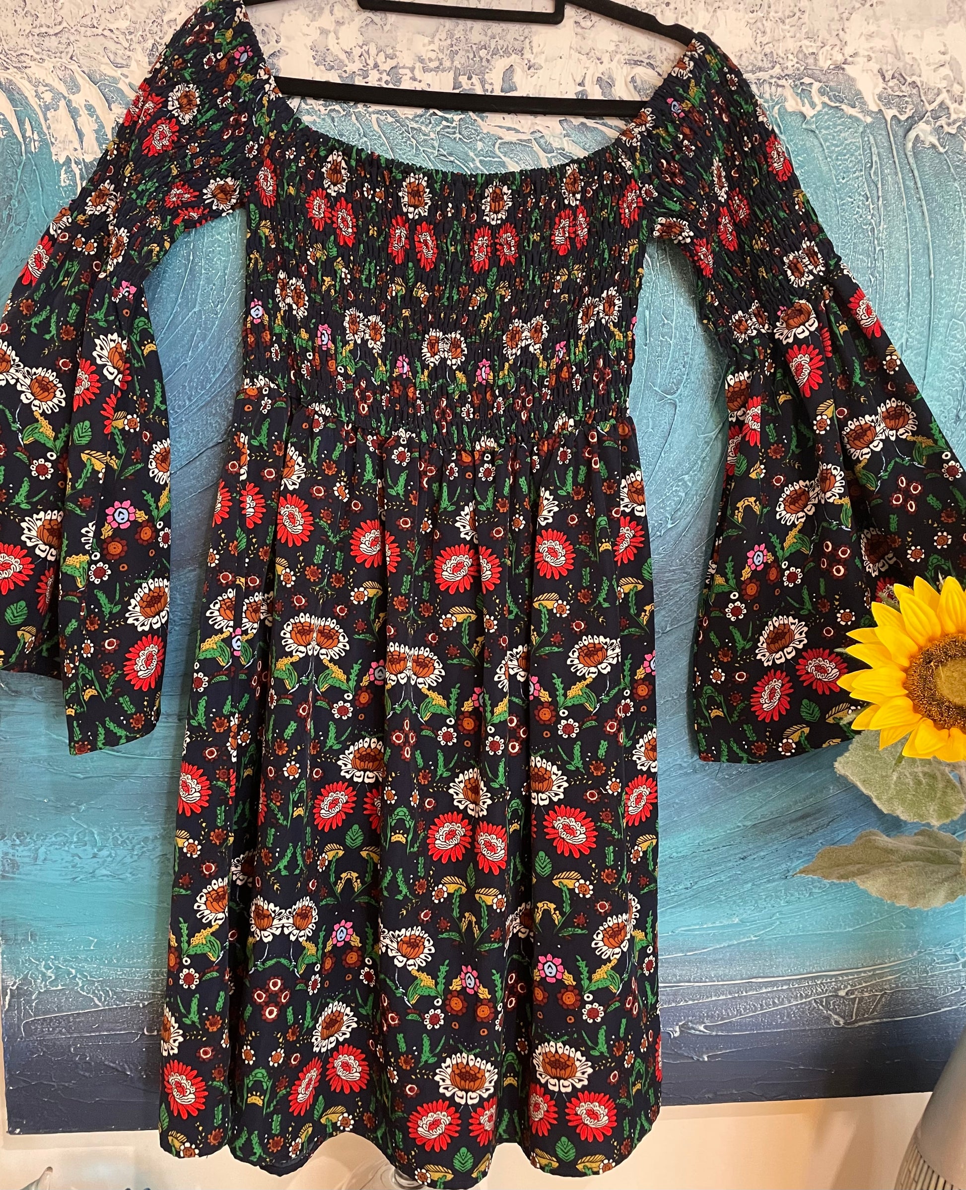 ‘Augustine’ branded mini dress featuring long bell sleeves and a comfy, flexi fit, shirred bodice.