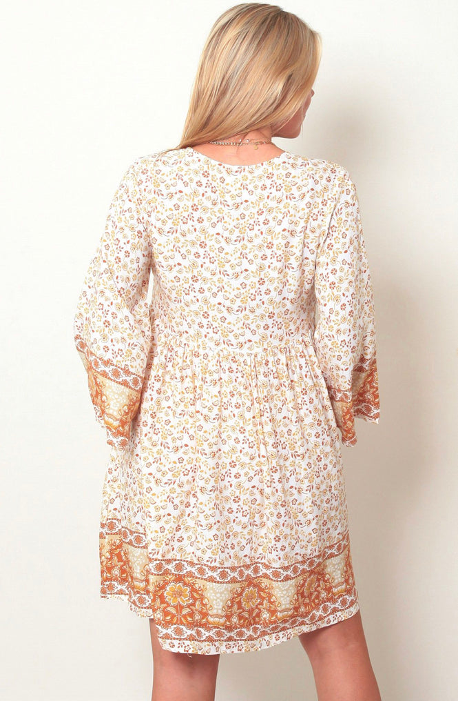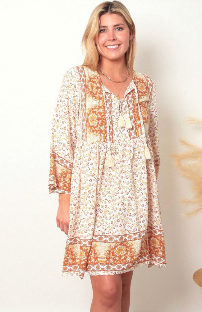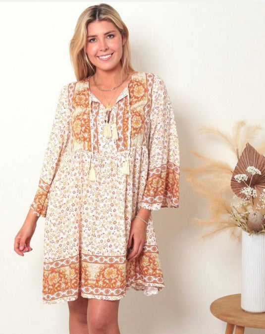 The 'Betty' mini dress features funky tassel ties at the neckline, billowy three quarter length sleeves and a loose, floaty mini length skirt. Pair with tights, boots and a jacket and wear all year round.