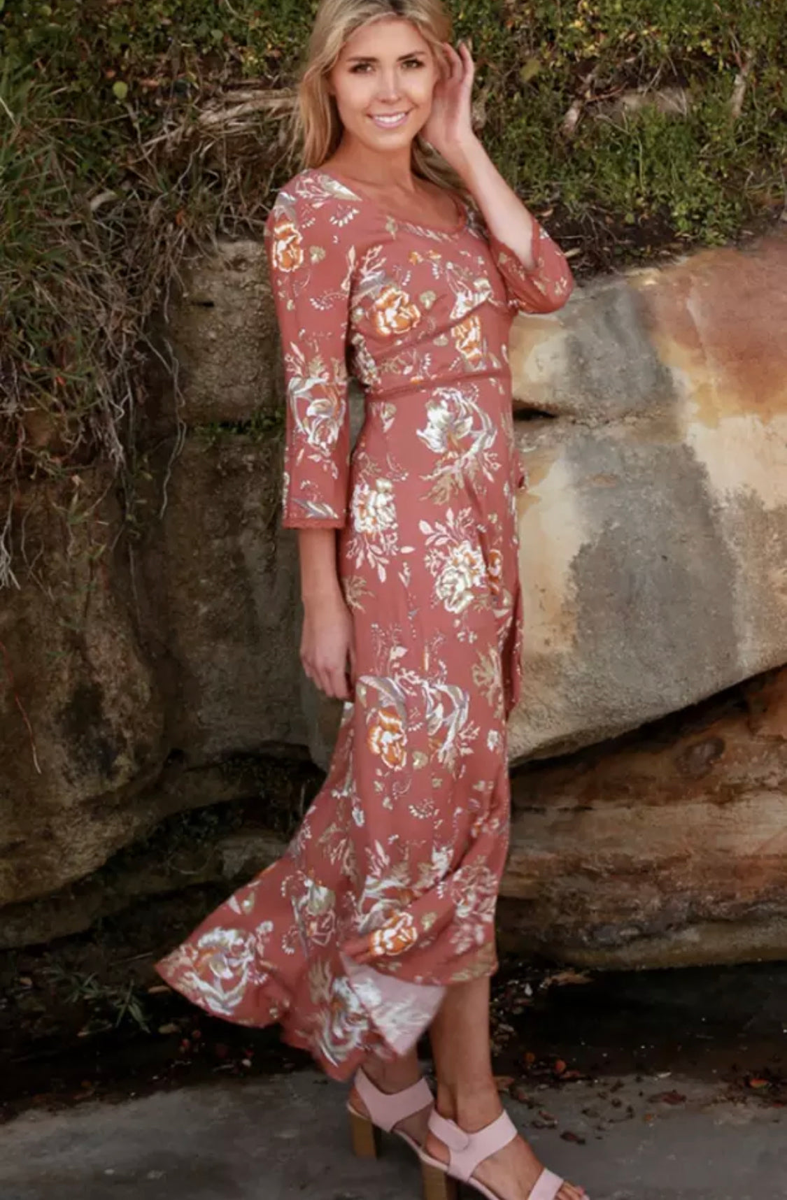 The 'Drew' midi dress features pretty crochet lace detailing around the neckline, waist and bodice, 3/4 length sleeves and a frilled, faux wrap style, hi-lo skirt.