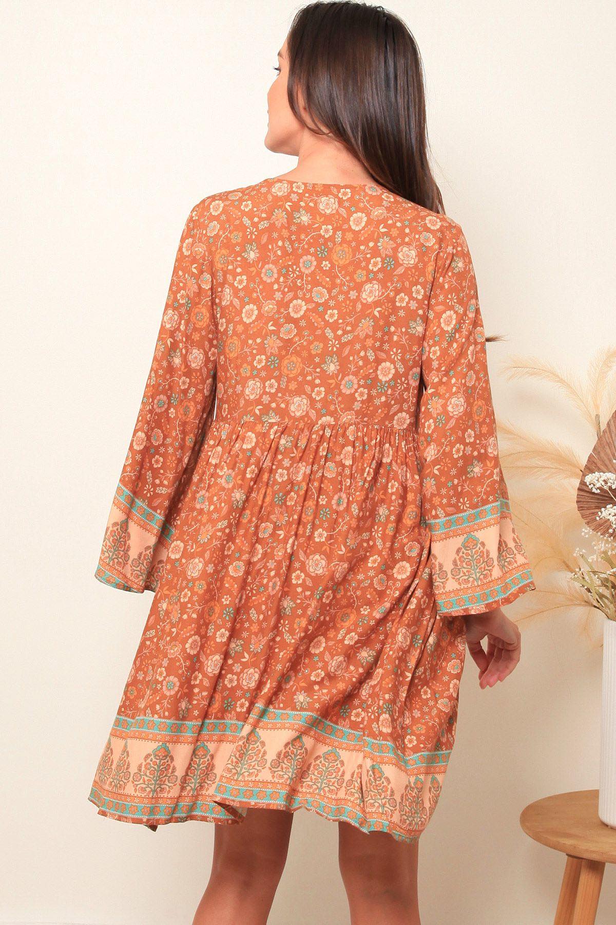The 'Lara' mini dress features 3/4 length sleeves, round neck with tassel ties and a floaty mini length skirt.