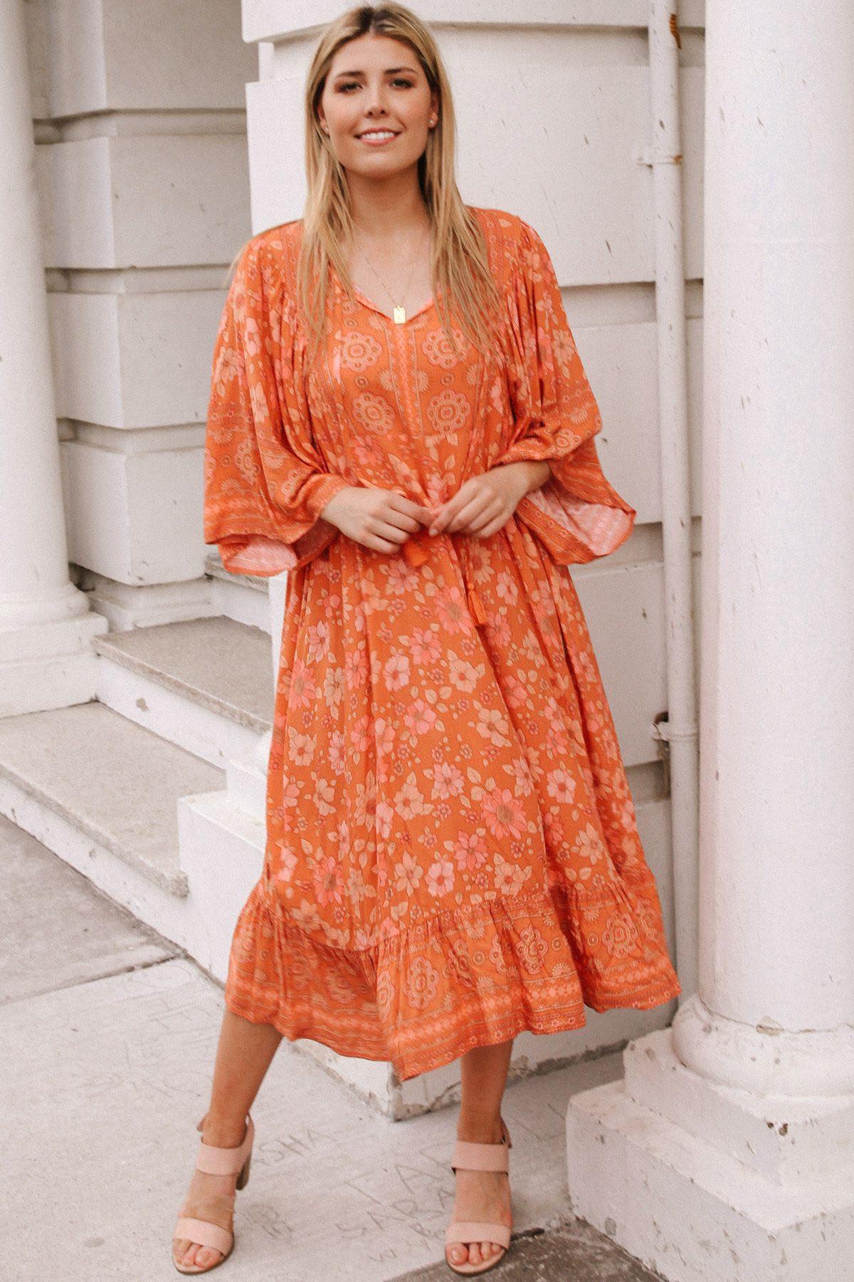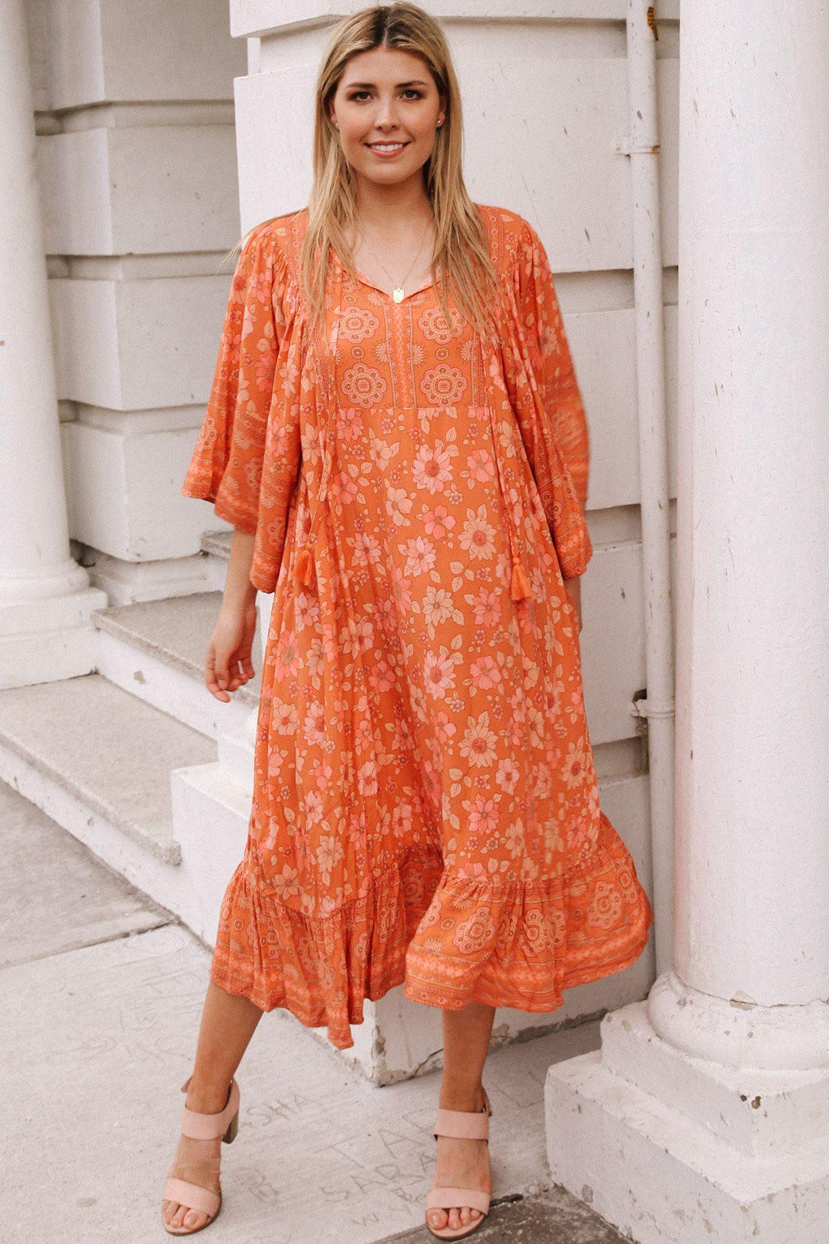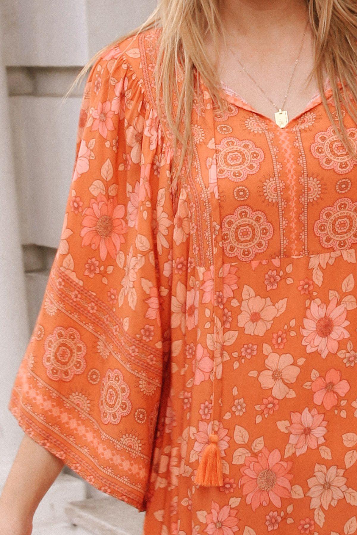 The ‘Nancie’ midi dress features a fun & floaty smock style cut, half length bell sleeves and a midi length skirt.