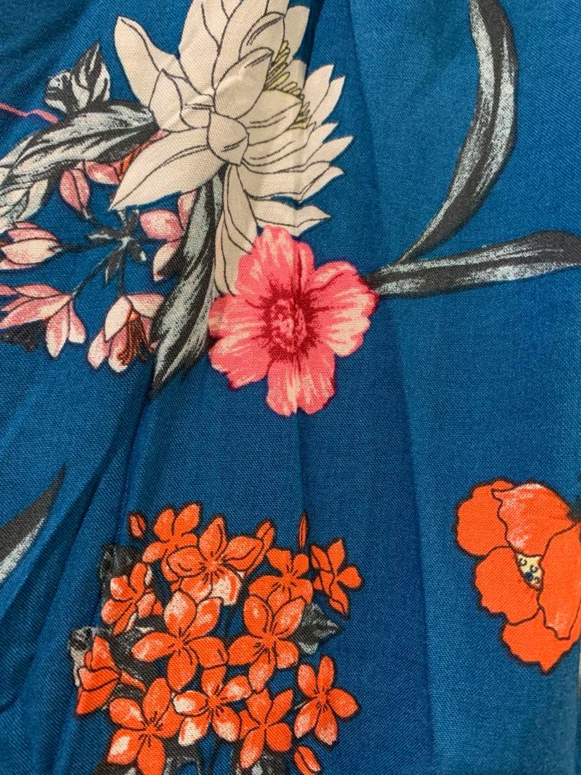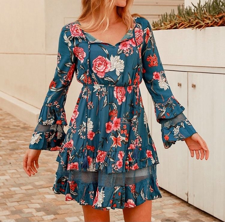 The 'Hana' mini dress features a gorgeous pink and blue floral print, long bell sleeves with ruffle and crochet lace detail, an elasticised waist and ruffled skirt.