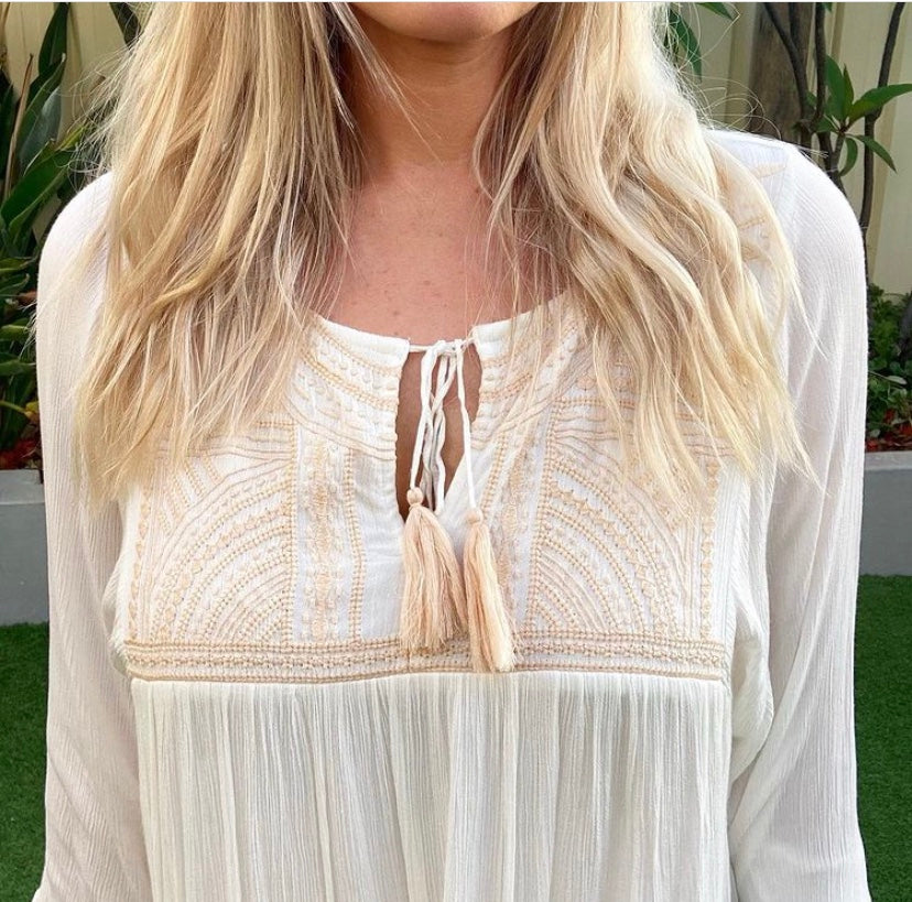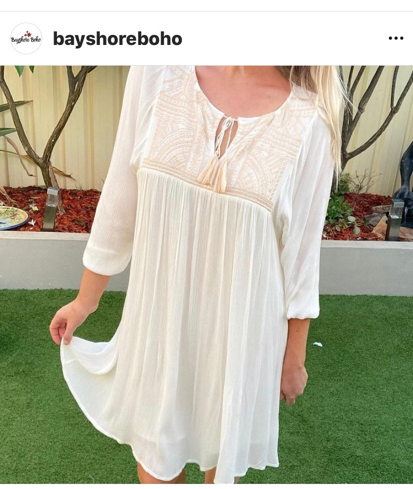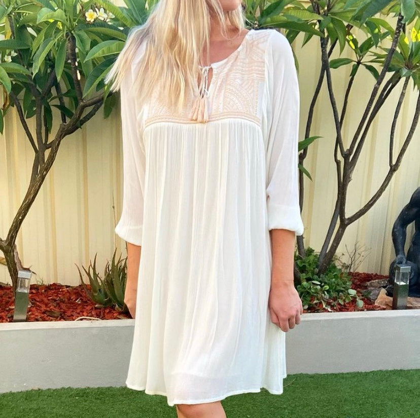 This Esprit shift style mini dress features 3/4 length sleeves, a pretty, embroidered bodice and a knee length skirt. Beautifully made and fully lined.