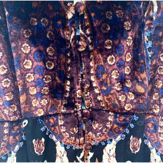 Beautiful "Free People" maxi dress features chiffon neck ties, stunning fully lined chiffon overlay with embossed velvet fleur-de-lys pattern and a full maxi skirt.