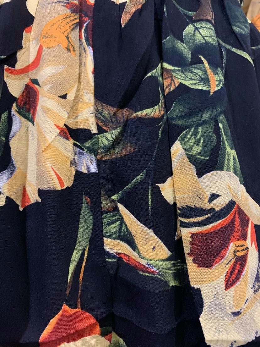 The 'Samantha' playsuit features a vibrant tropical print, V neckline, faux wrap style bodice, 3/4 length bell sleeves and flat lay front pockets.
