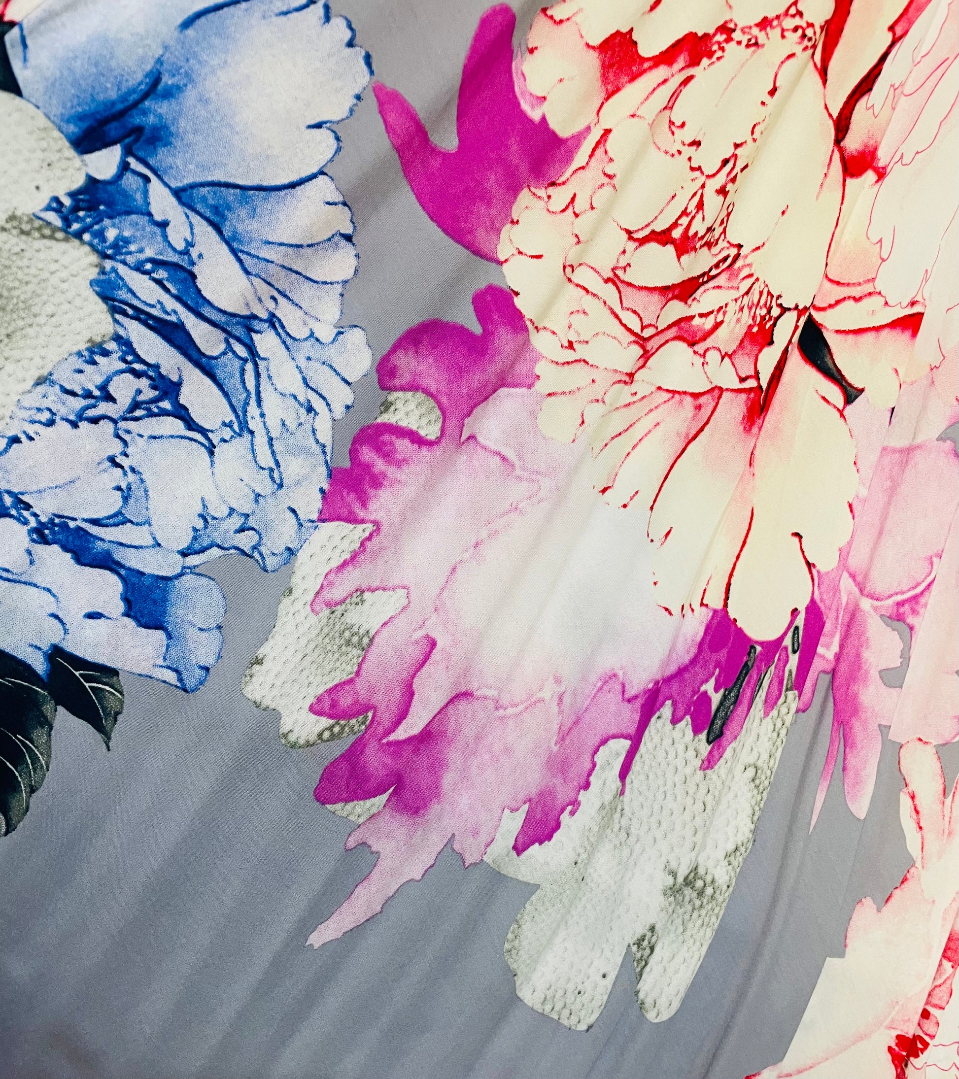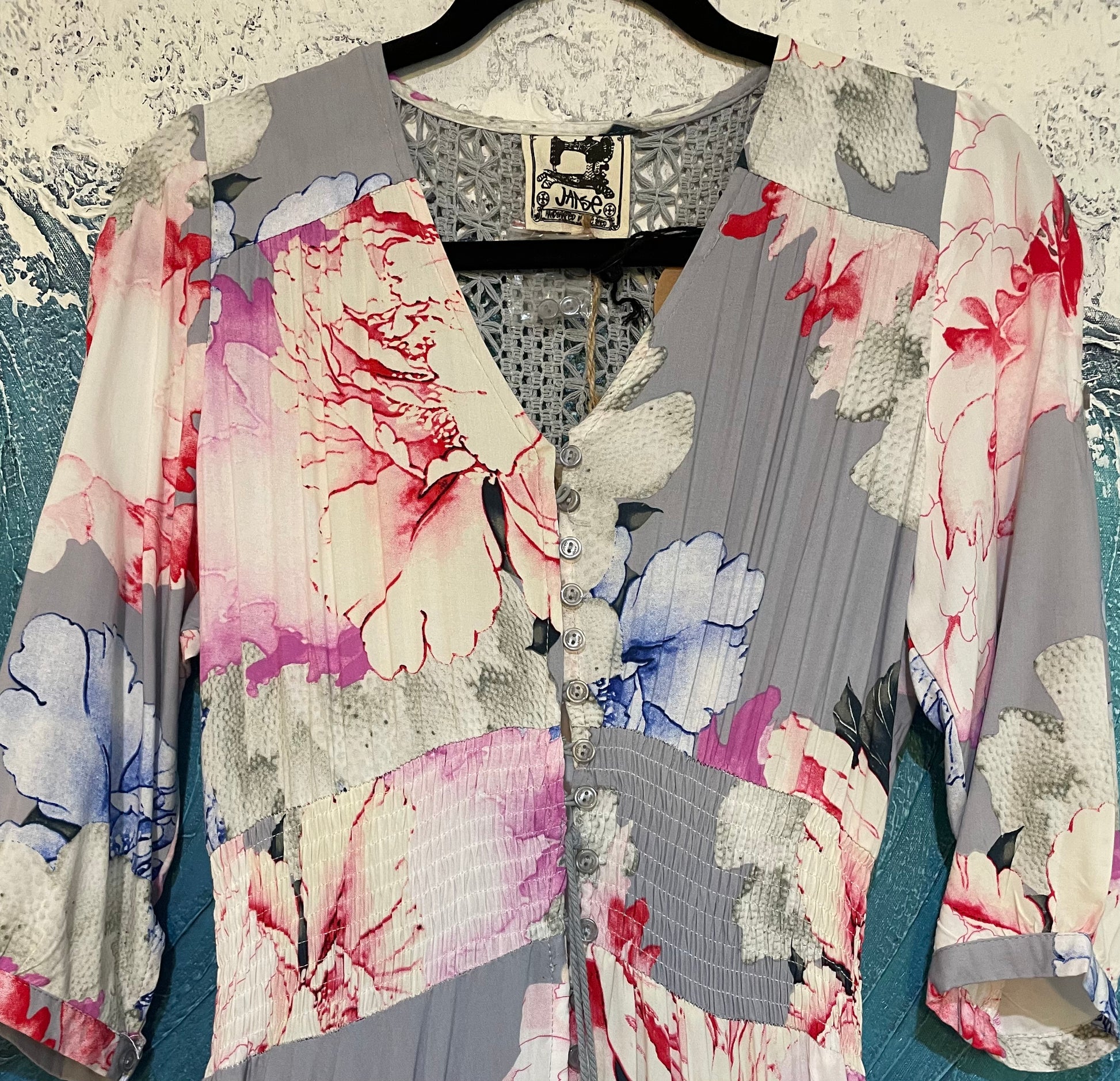 This pretty floral print Jaase maxi features half sleeves with roll up button tabs, a stretch elasticated waist, crochet detail through the back and a full maxi length skirt.
