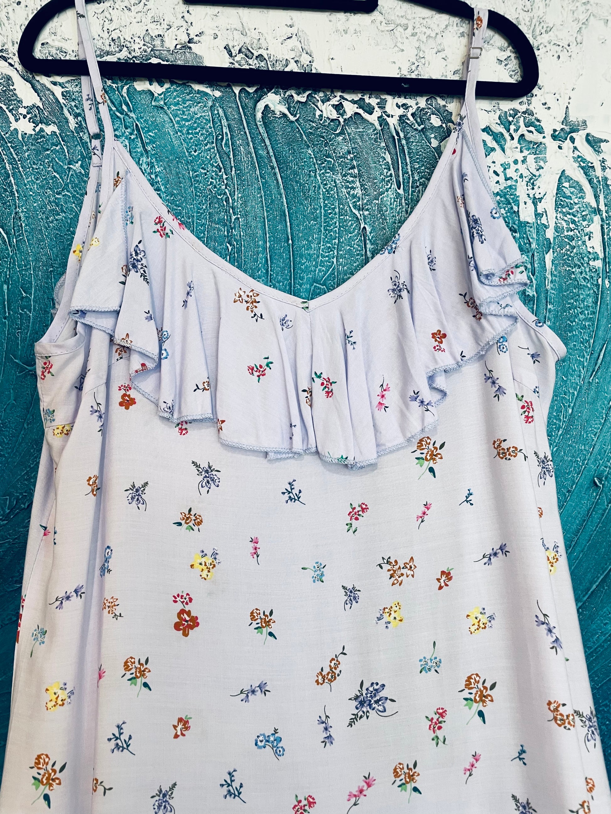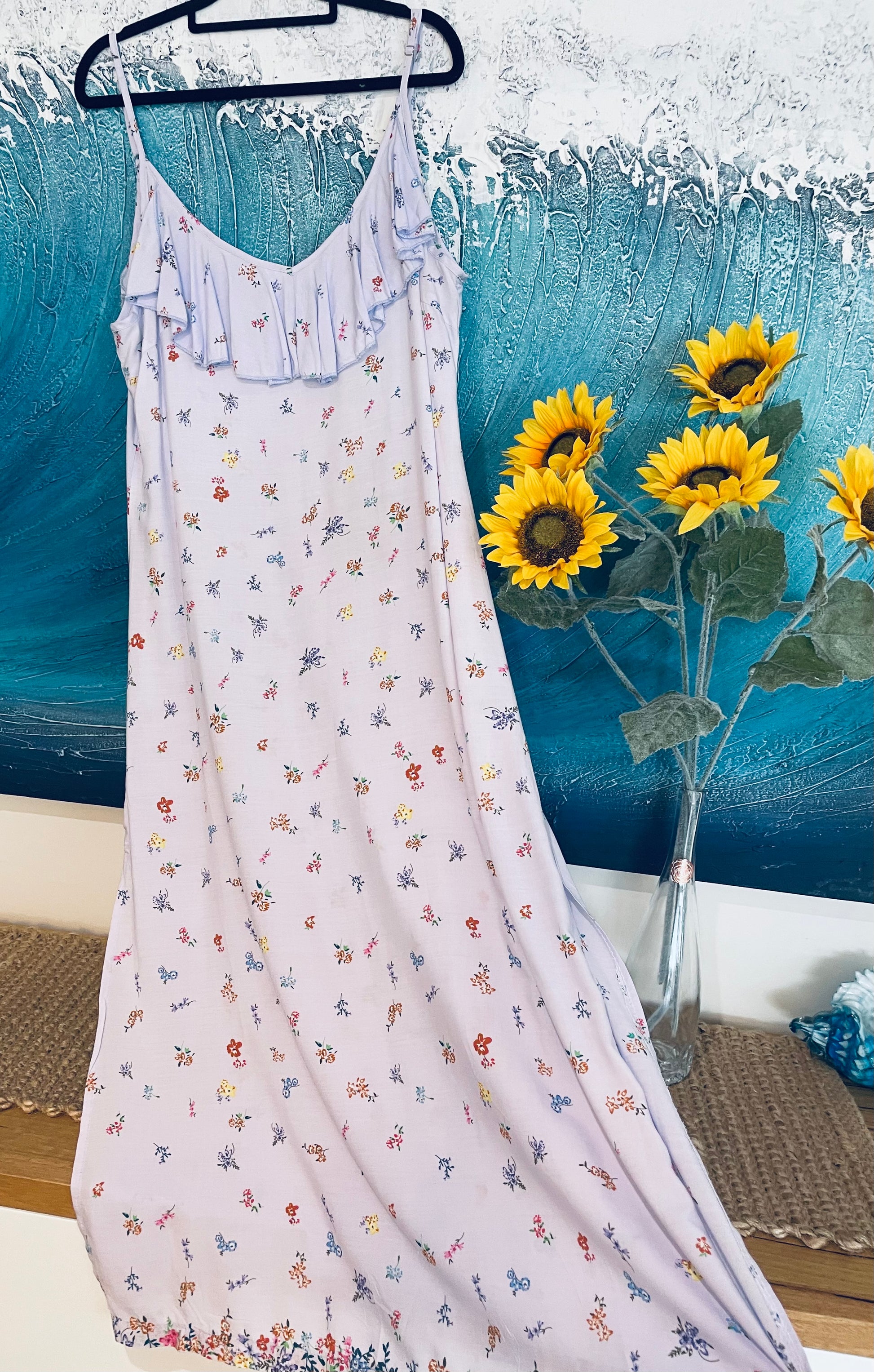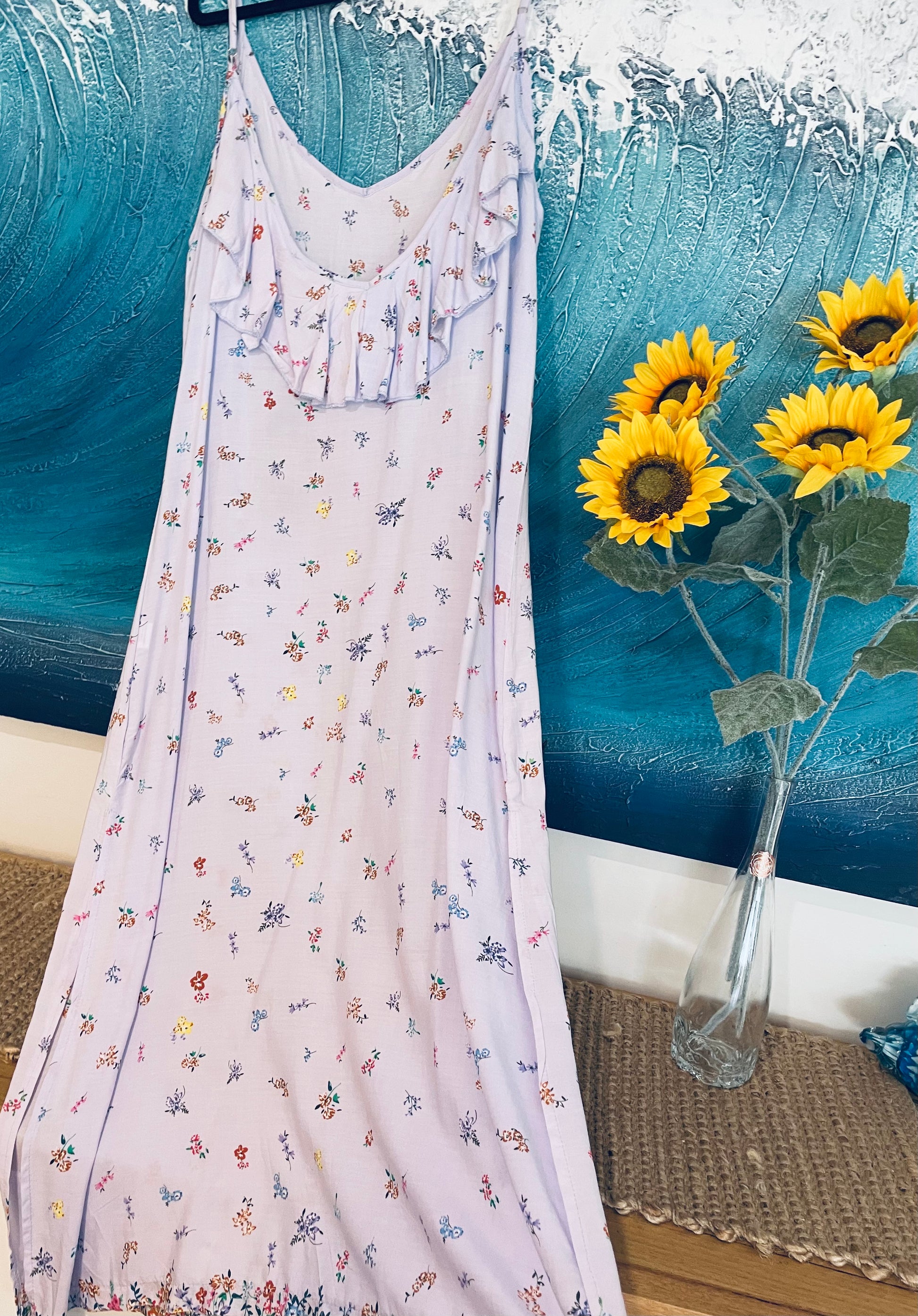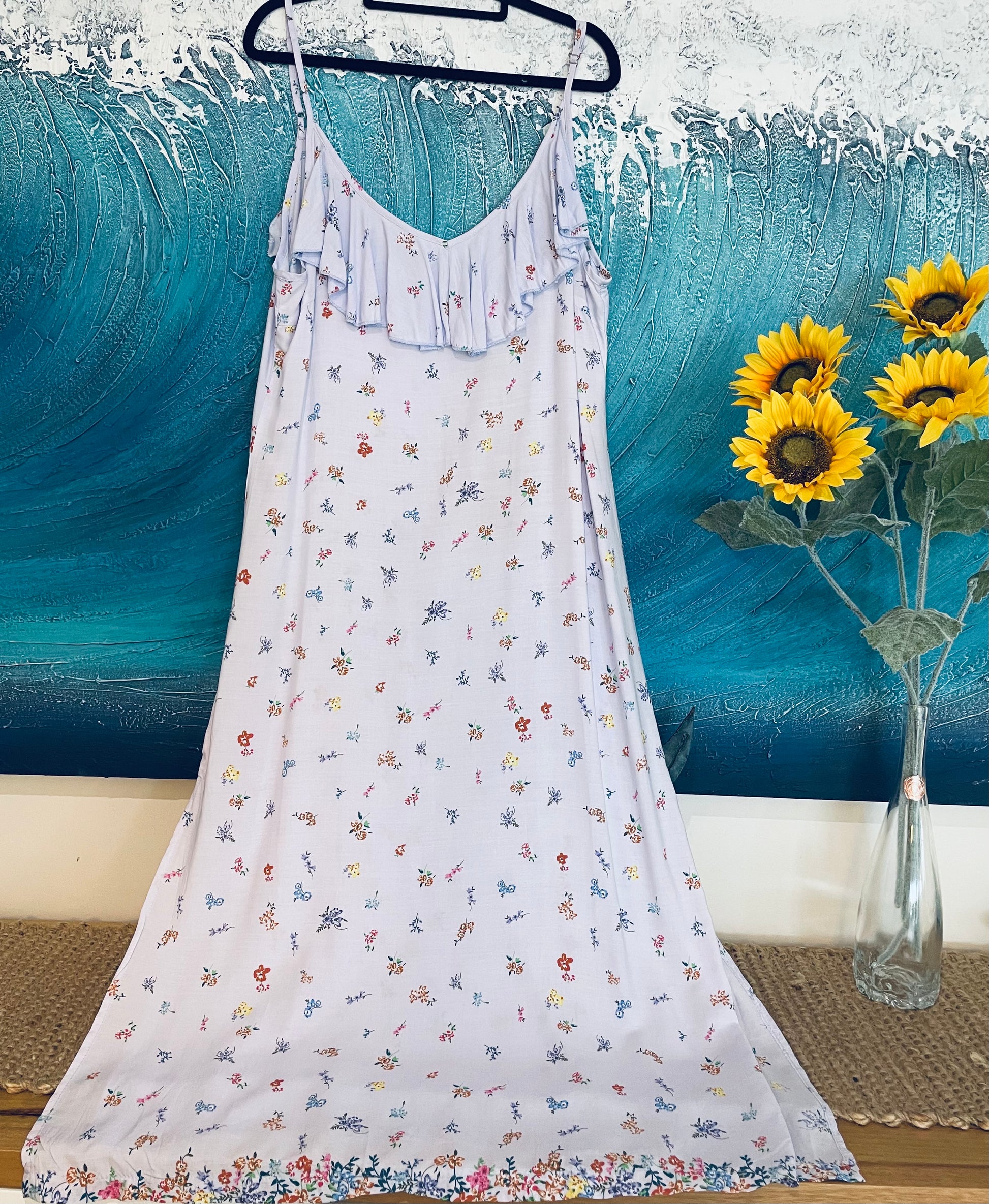 The Jaase “lavender fields” slip style midi dress features a V neckline with ruffle detail and adjustable shoestring straps. In buttery soft, breathable rayon, this piece is versatile, cool and comfy.
