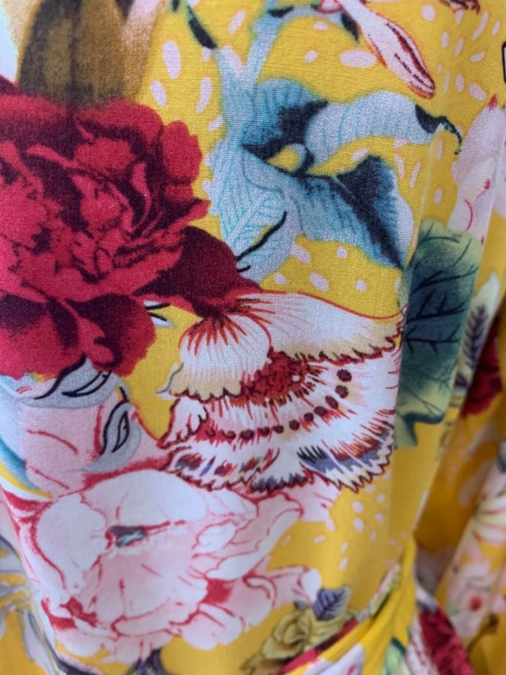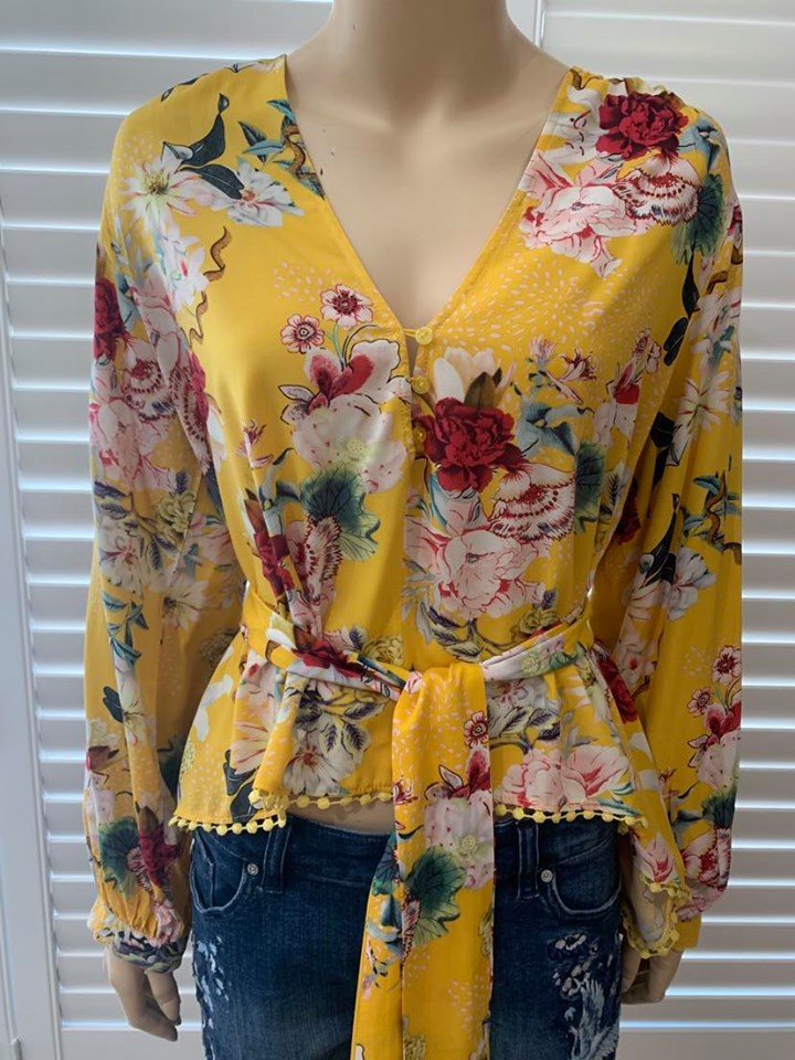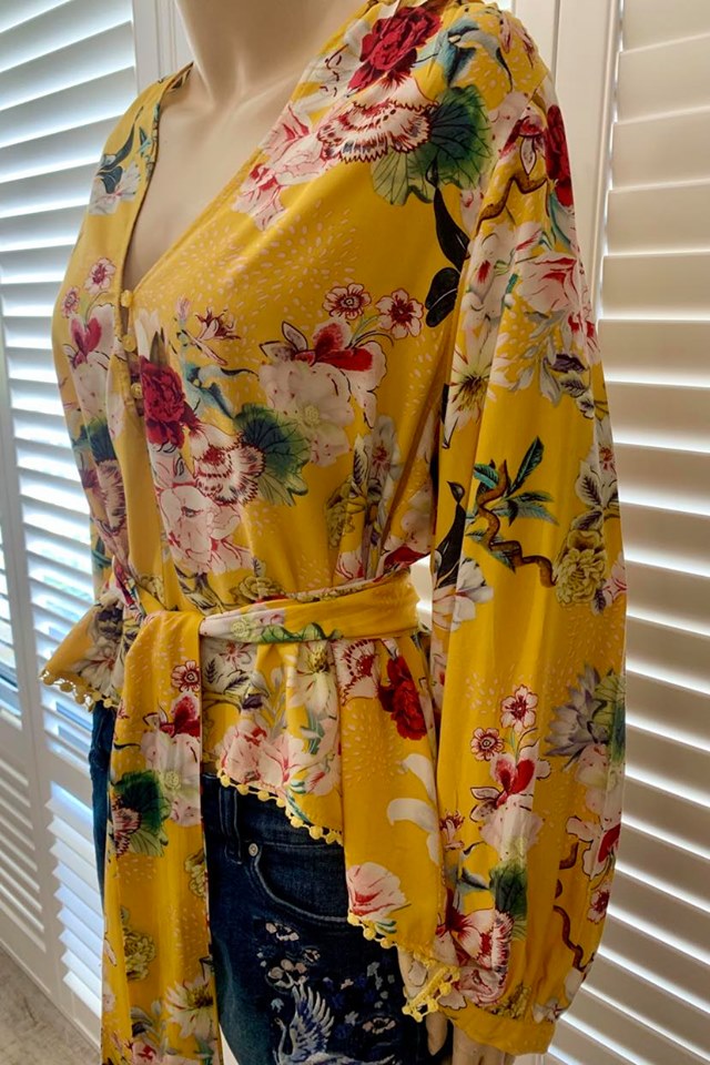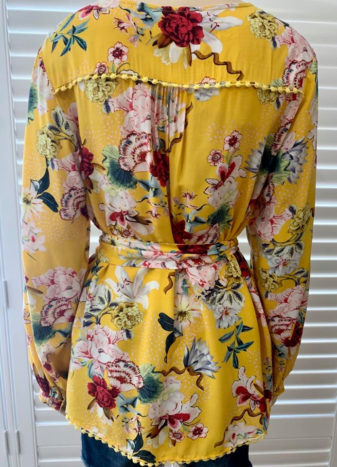 This pretty long sleeve Jaase top features long sleeves, a tie belt and a vibrant buttercup yellow floral print.