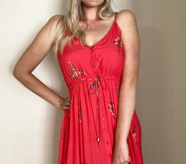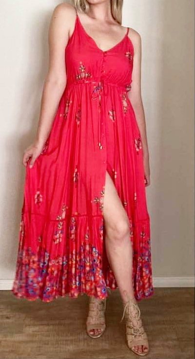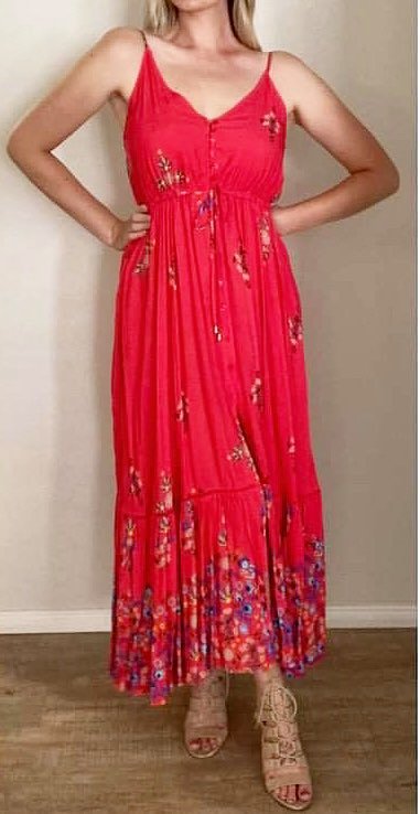 This gorgeous Jaase 'Sunset' floral maxi features the prettiest print on a stunning dark coral base, it has adjustable spaghetti straps, an elastic drawstring waist and full maxi skirt with floral ruffle hem.