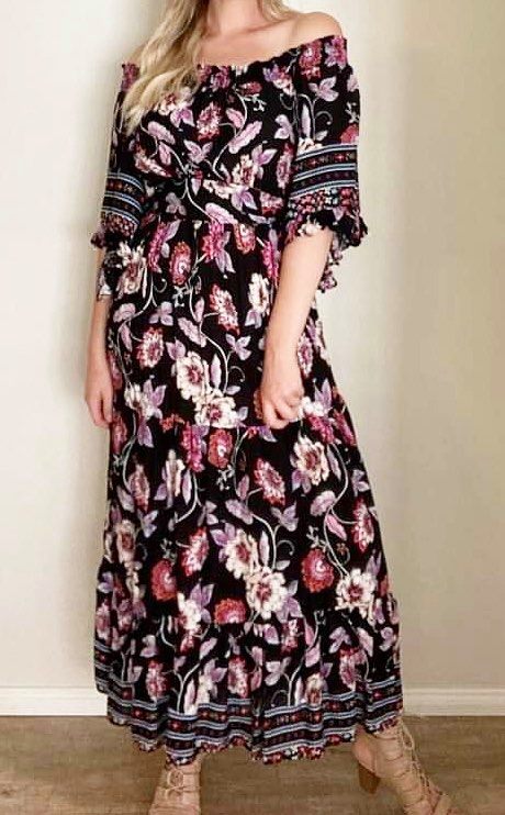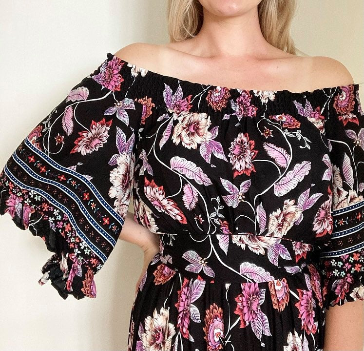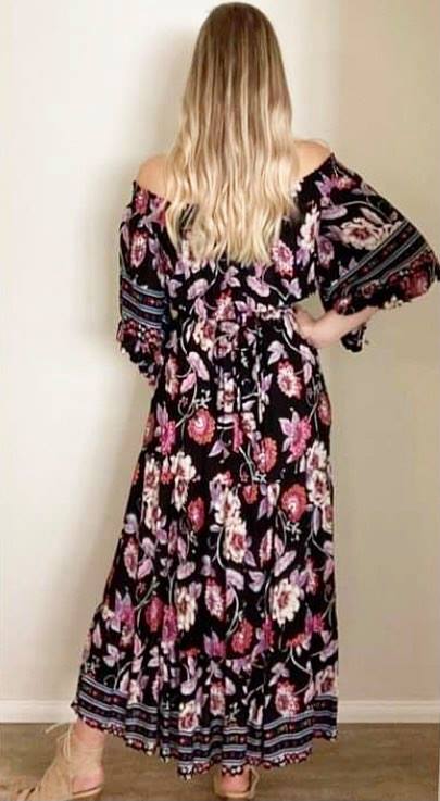 This Jaase floral maxi features a pretty bell sleeve, tie belt and can be worn on or off the shoulders. It is elasticated around the neckline and through the waist.