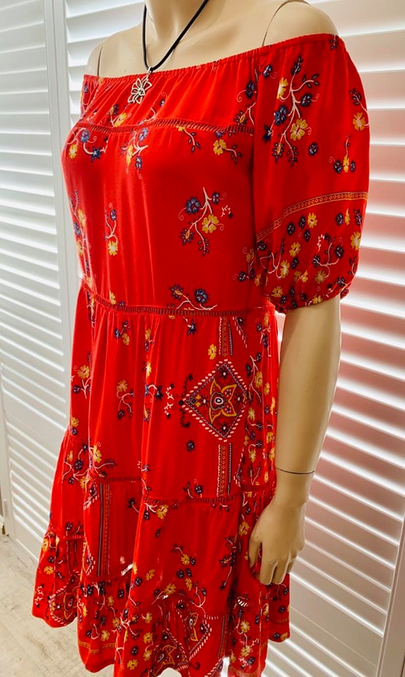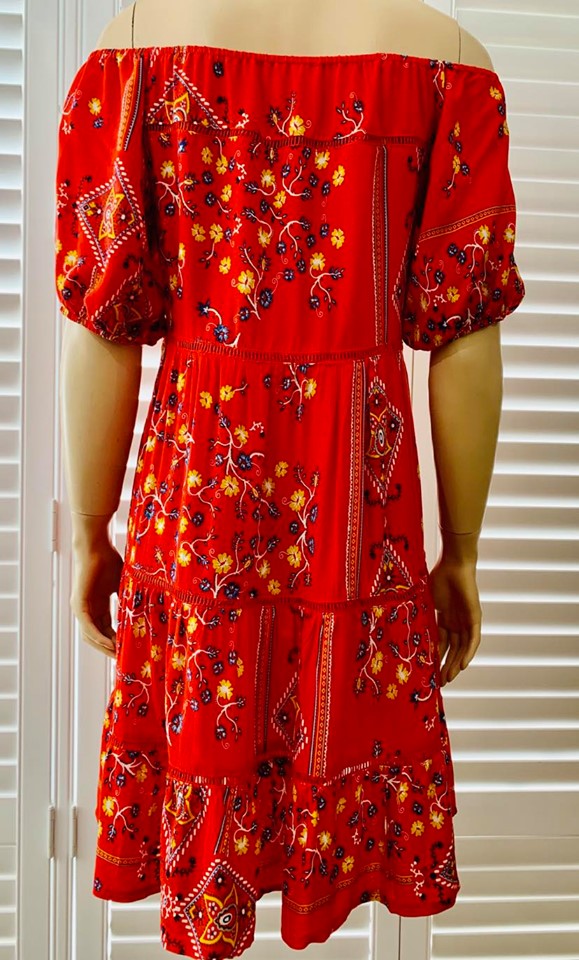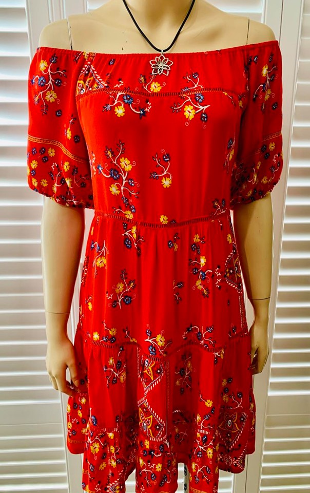 Jaase red floral mini dress with crochet detail through bust and skirt. Can be worn on or off the shoulders.