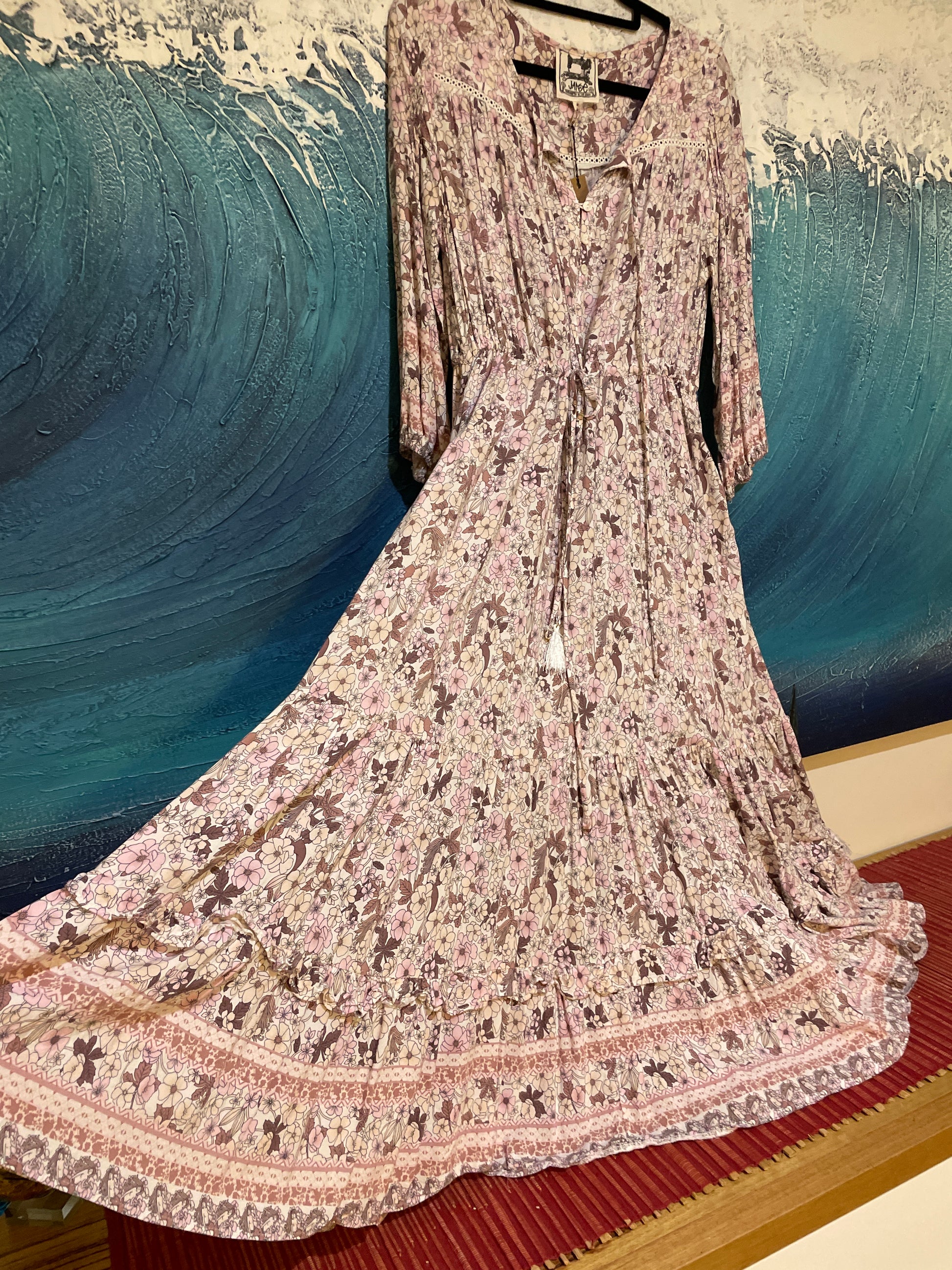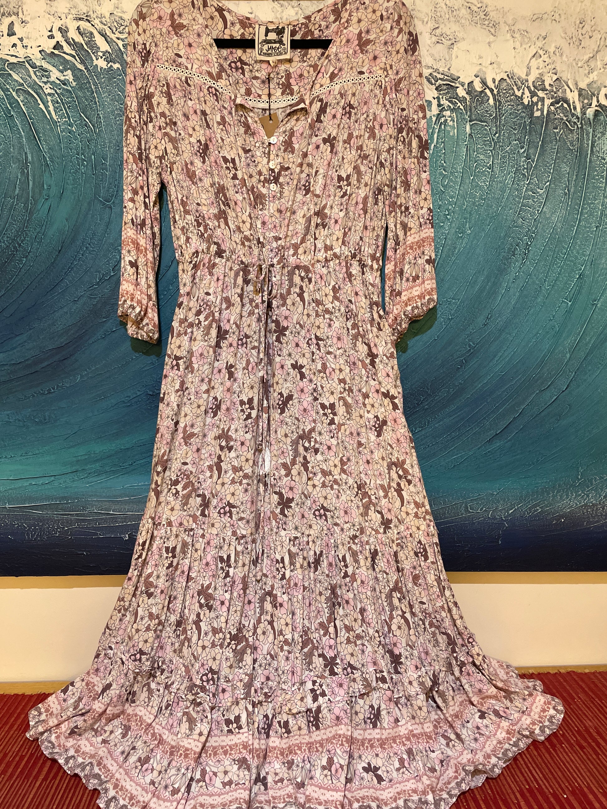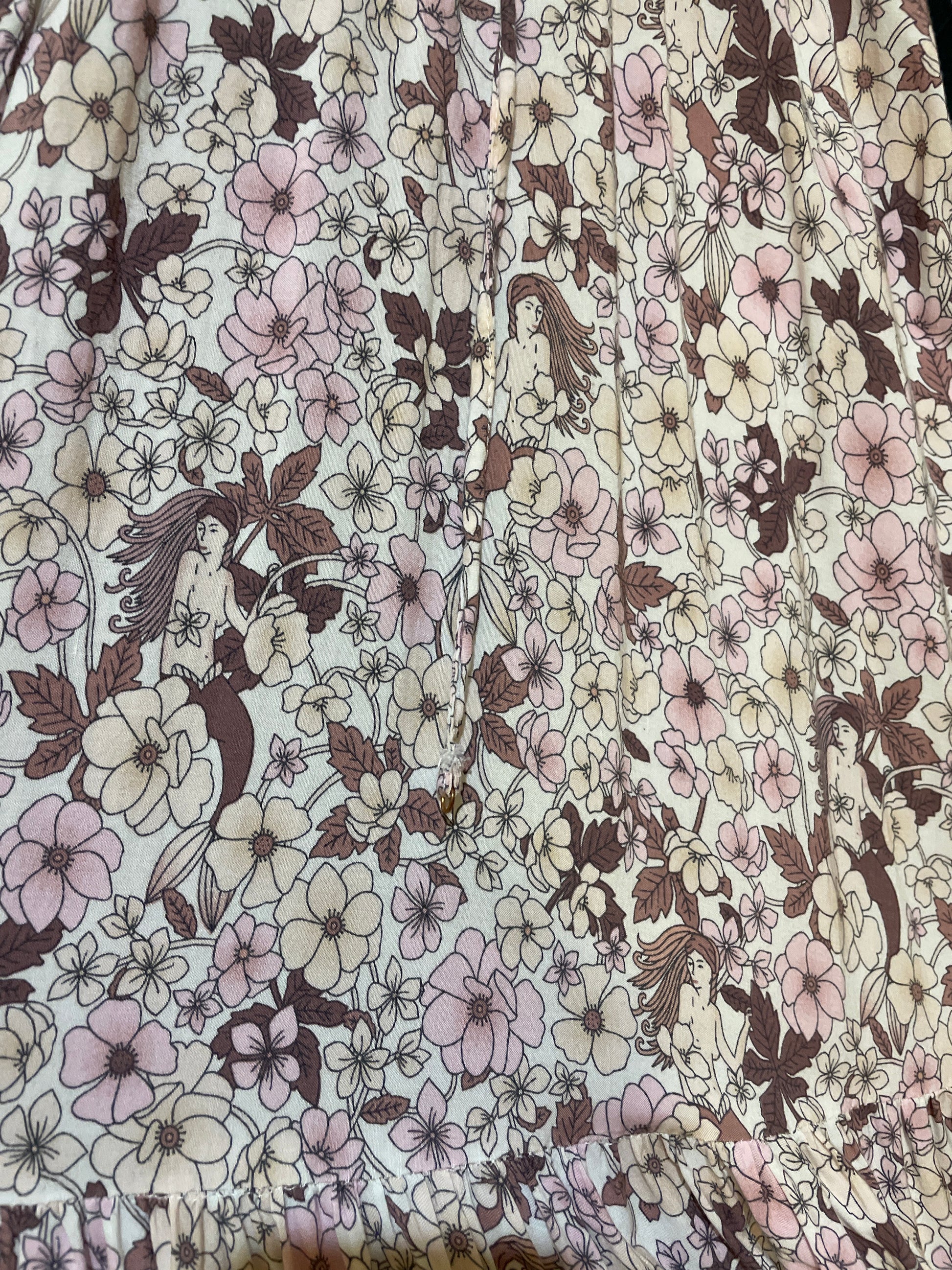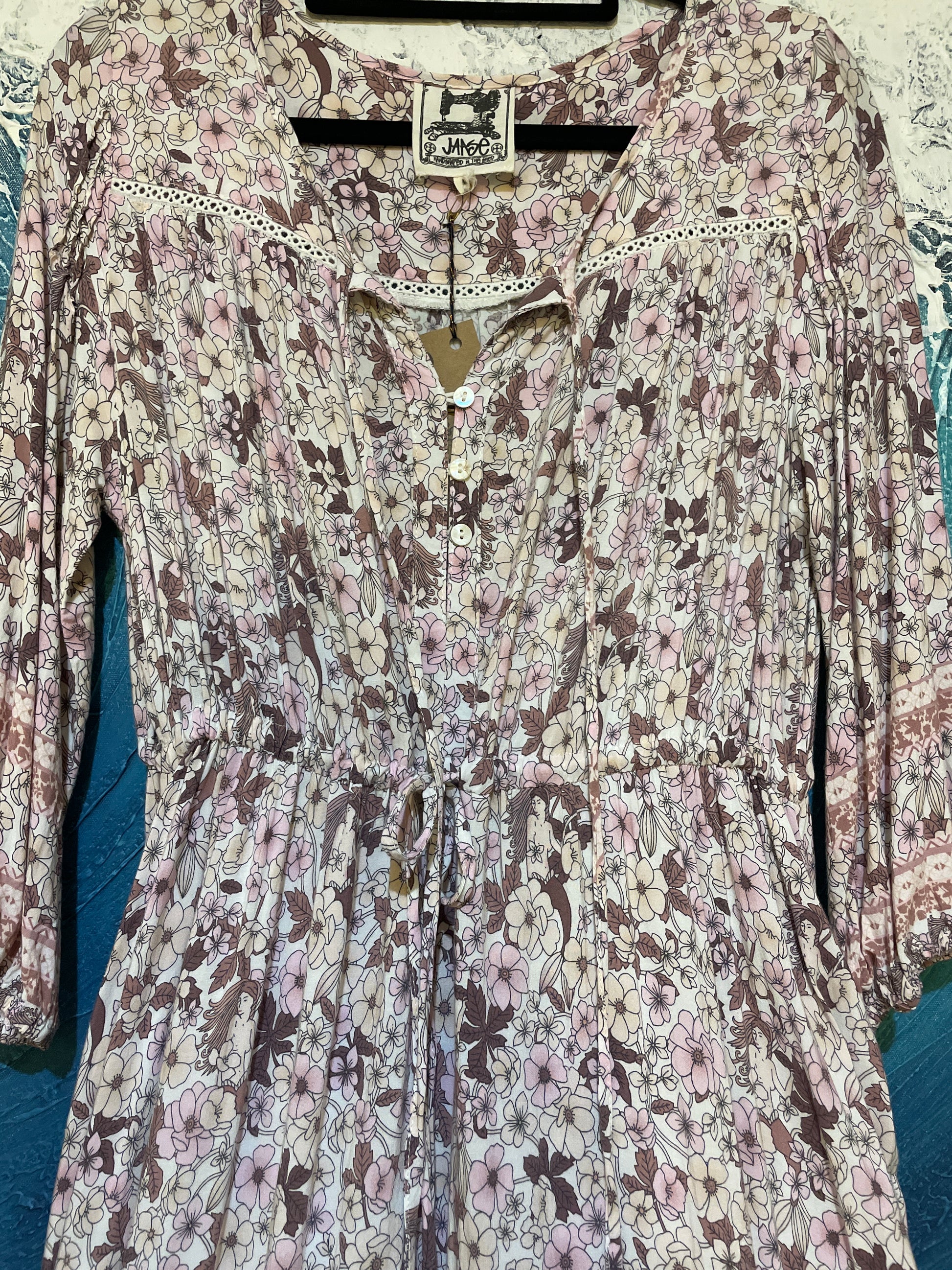 This stunning Jaase midi dress features a gorgeous floral mermaid print. It has a channel drawstring waist and ties at the neckline.