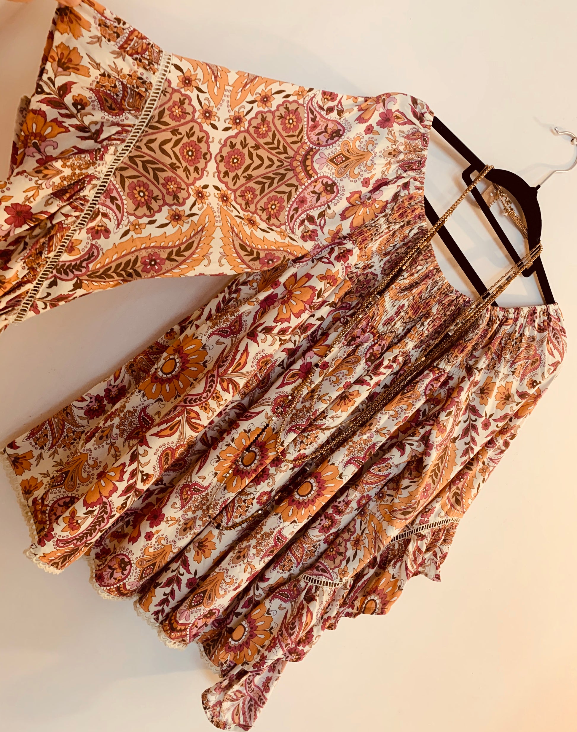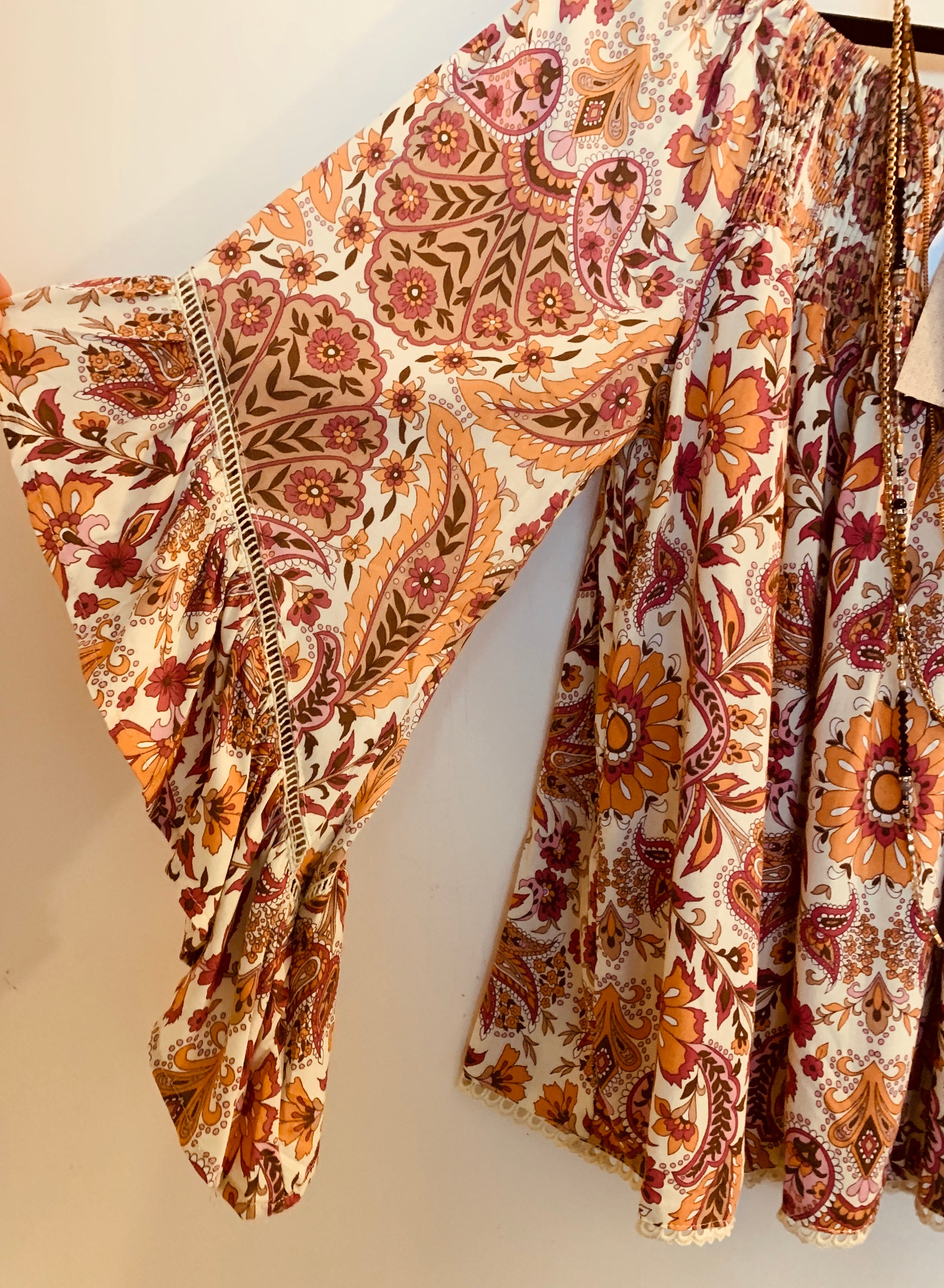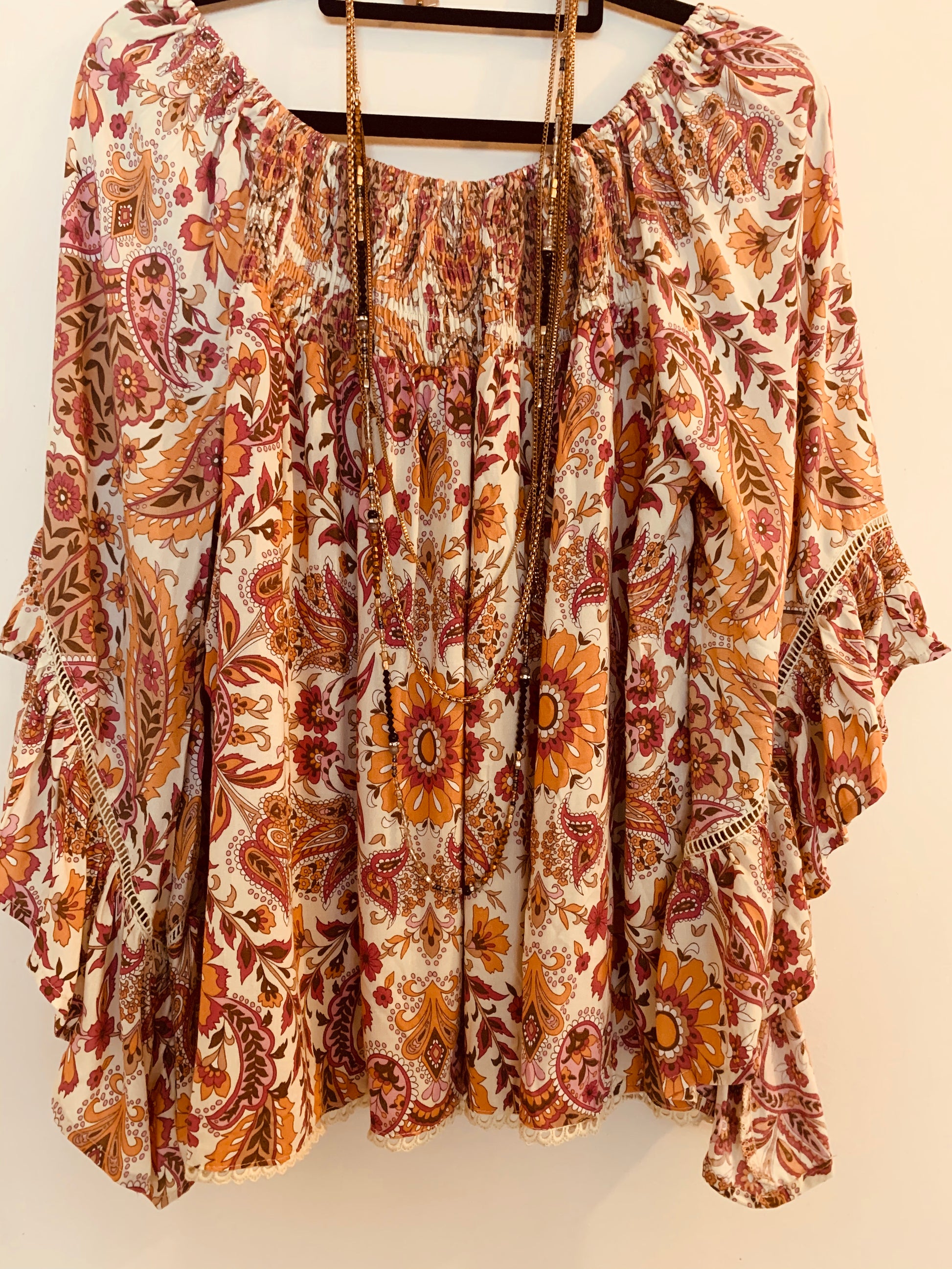This boho beauty has the most gorgeous, floaty flutter, bell sleeves and comfy elasticised, off the shoulder, neckline. The wide neckline shirring allows this top to be worn either on or off the shoulder.