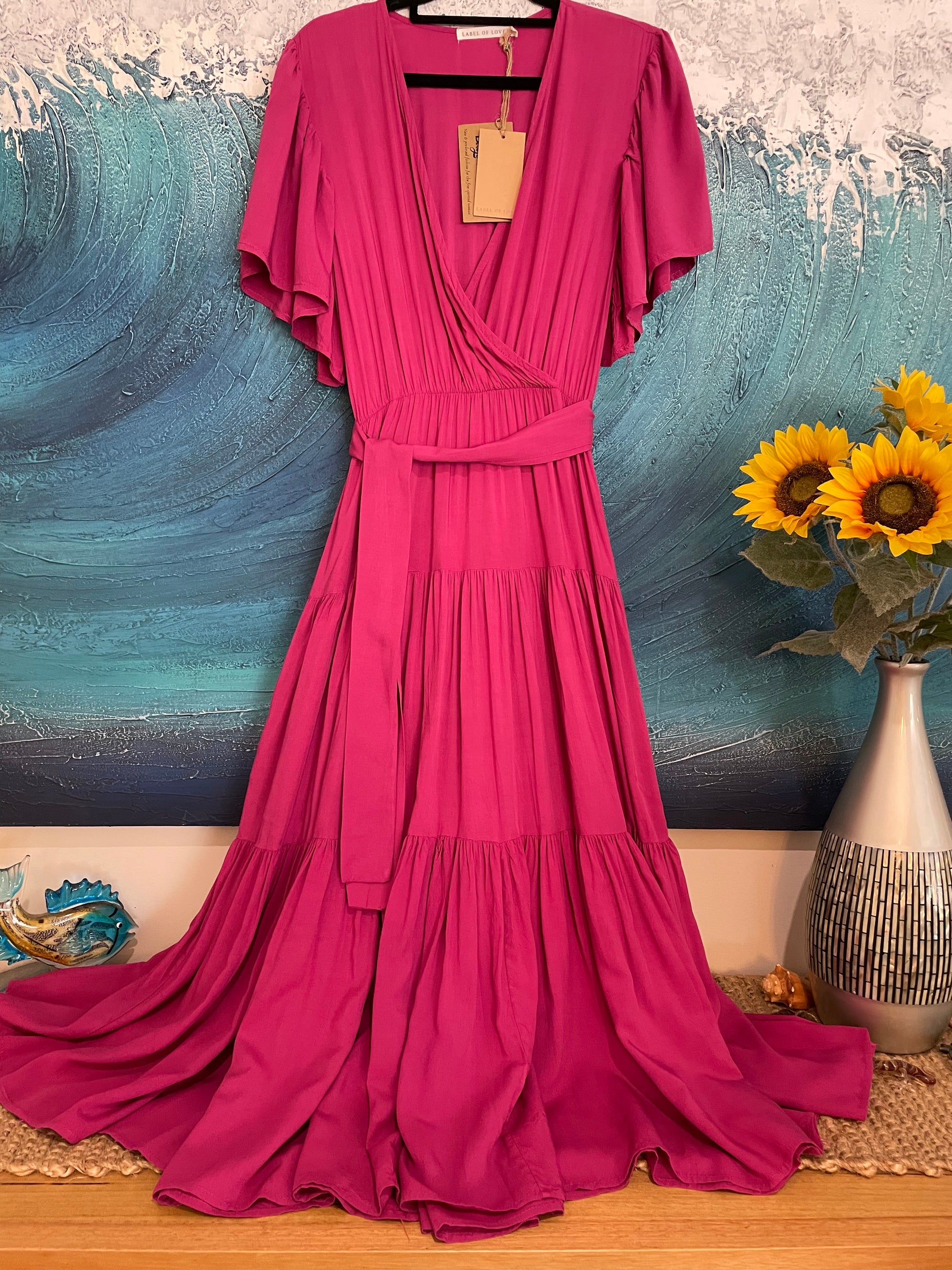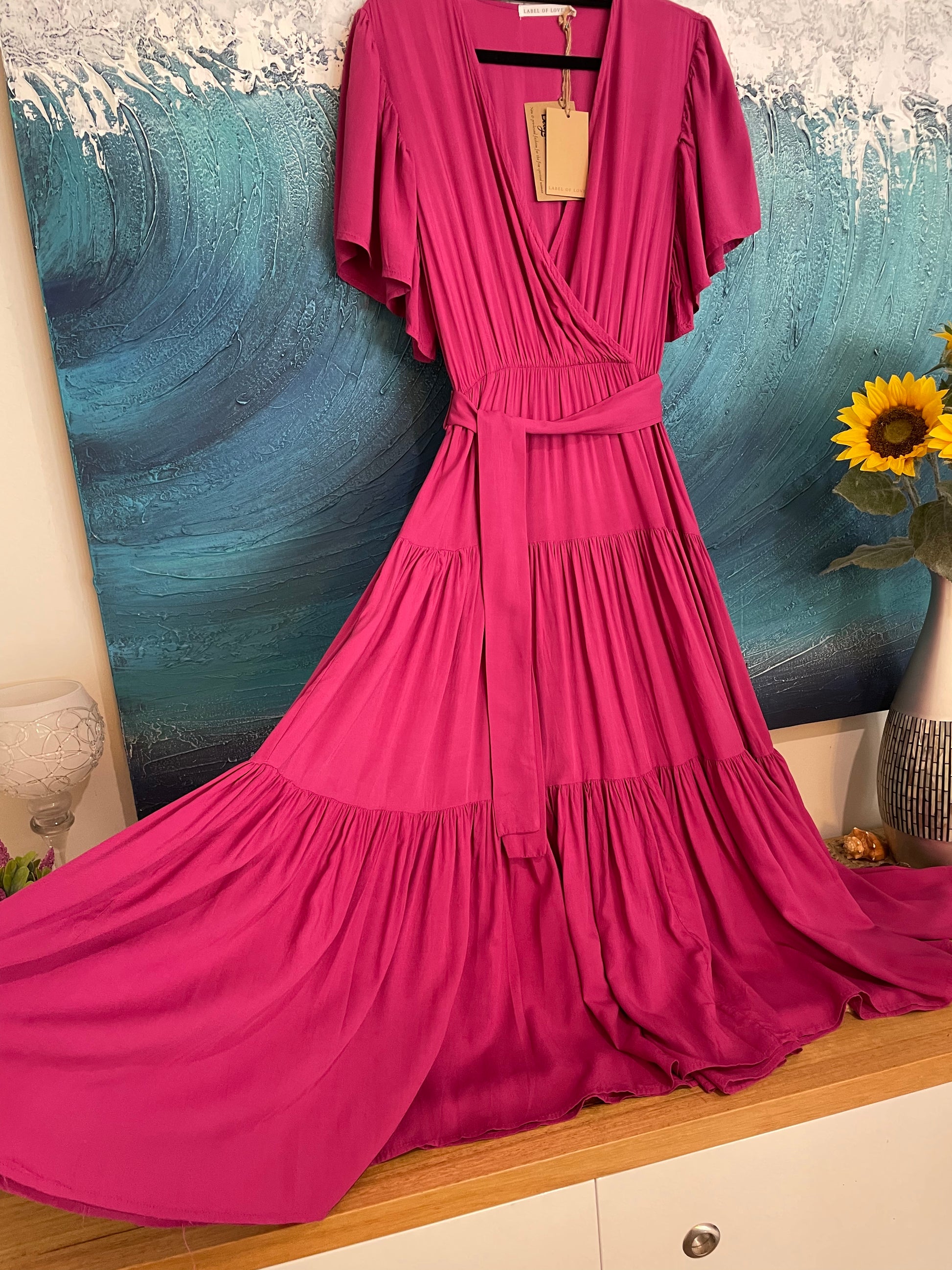 Vibrant fuschia midi dress from Label of Love with pretty flutter sleeves, crossover style bodice, elasticised waist with tie belt and three tier, floaty, midi length skirt.