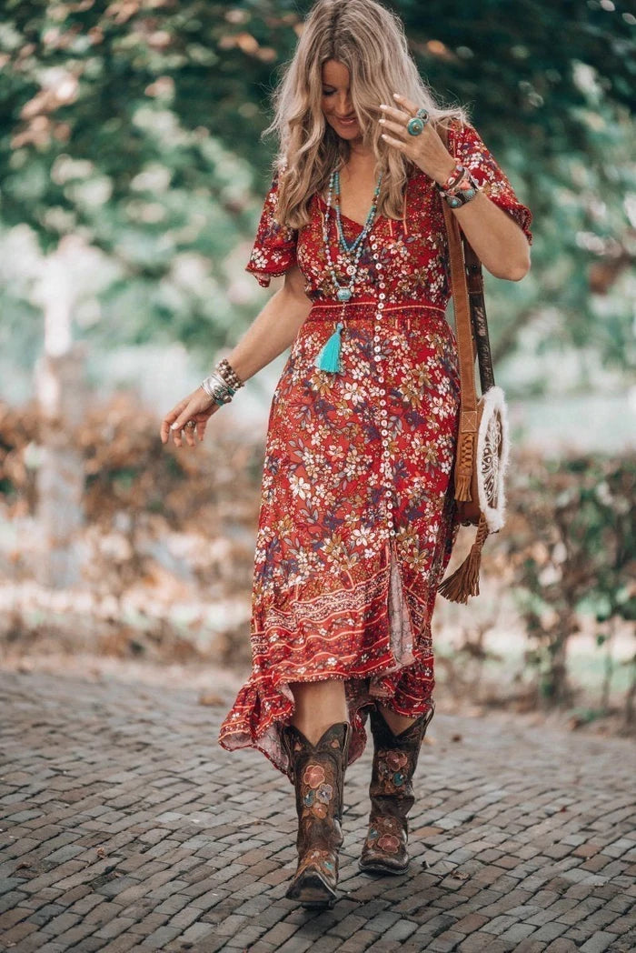 Button through style with comfy, elasticised waist, pretty flutter sleeves and a subtle scooped/hi-lo, floaty, maxi length skirt.