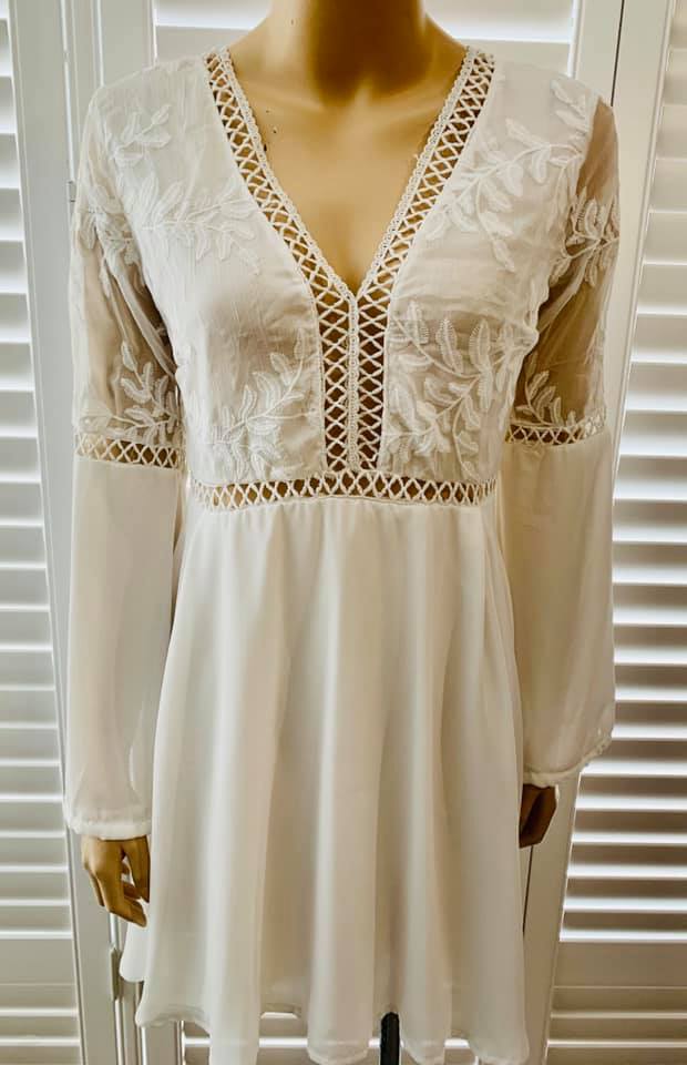 Gorgeous long sleeve white mini dress with pretty floral embroidered bodice and sexy open back