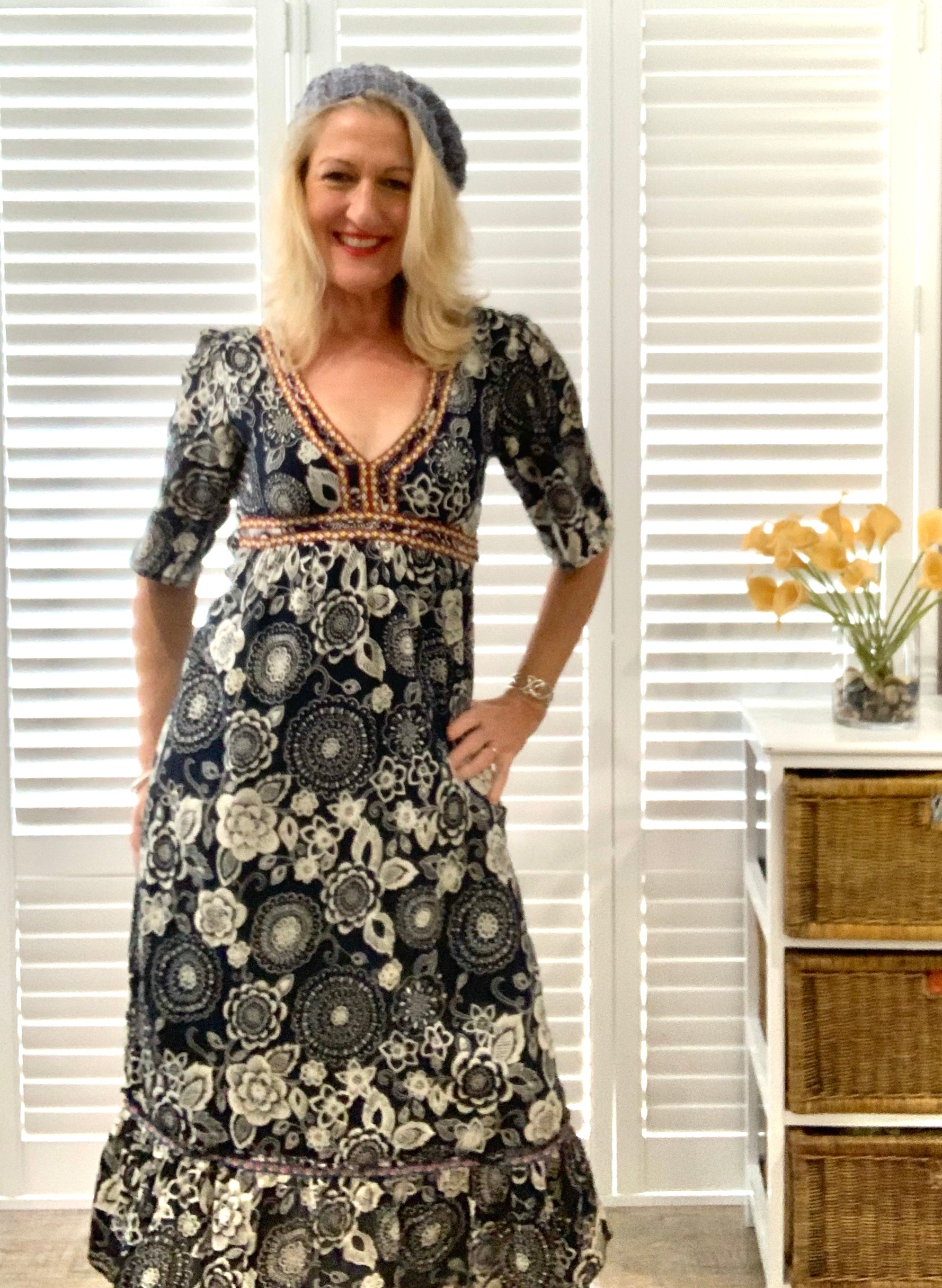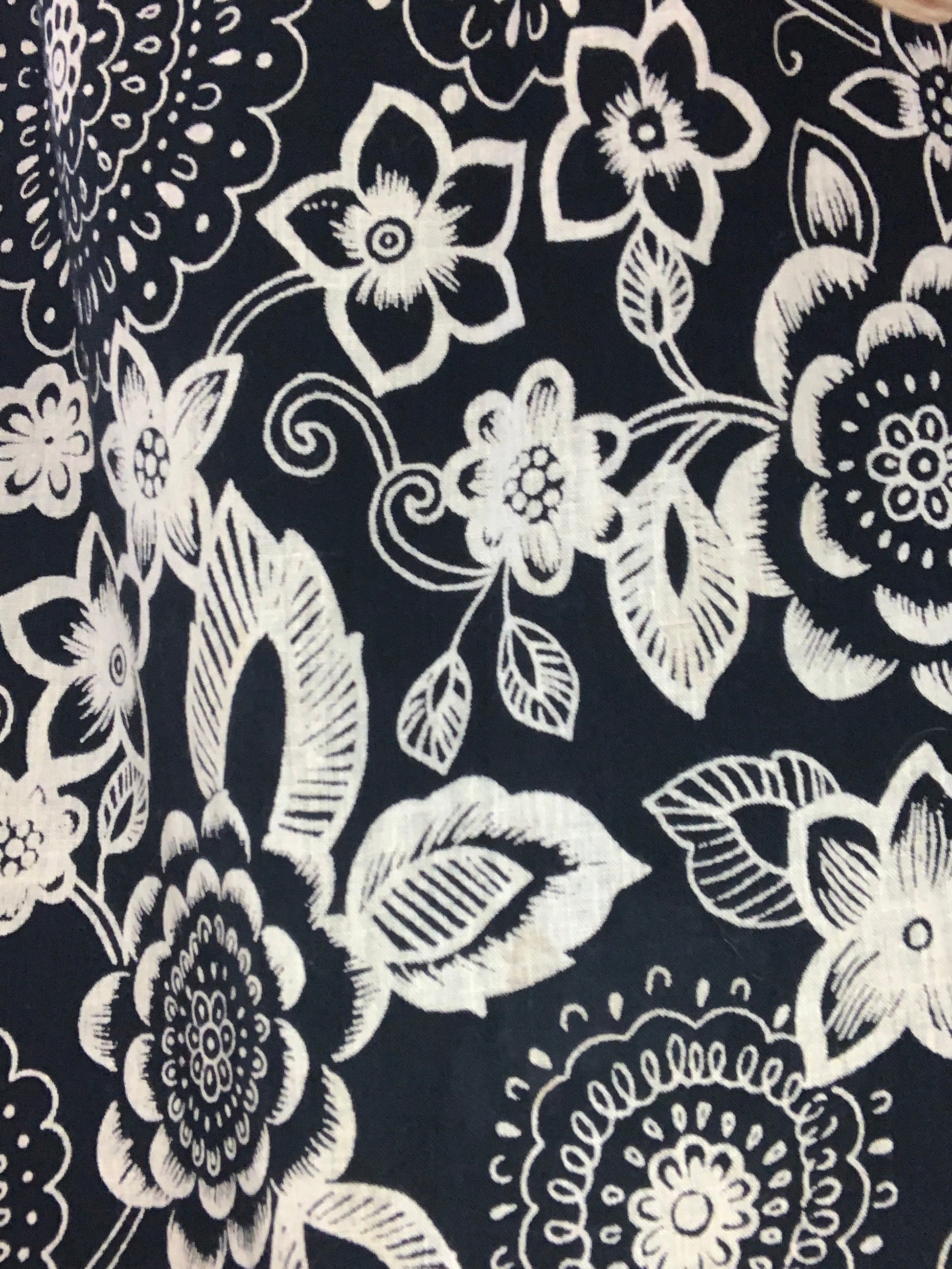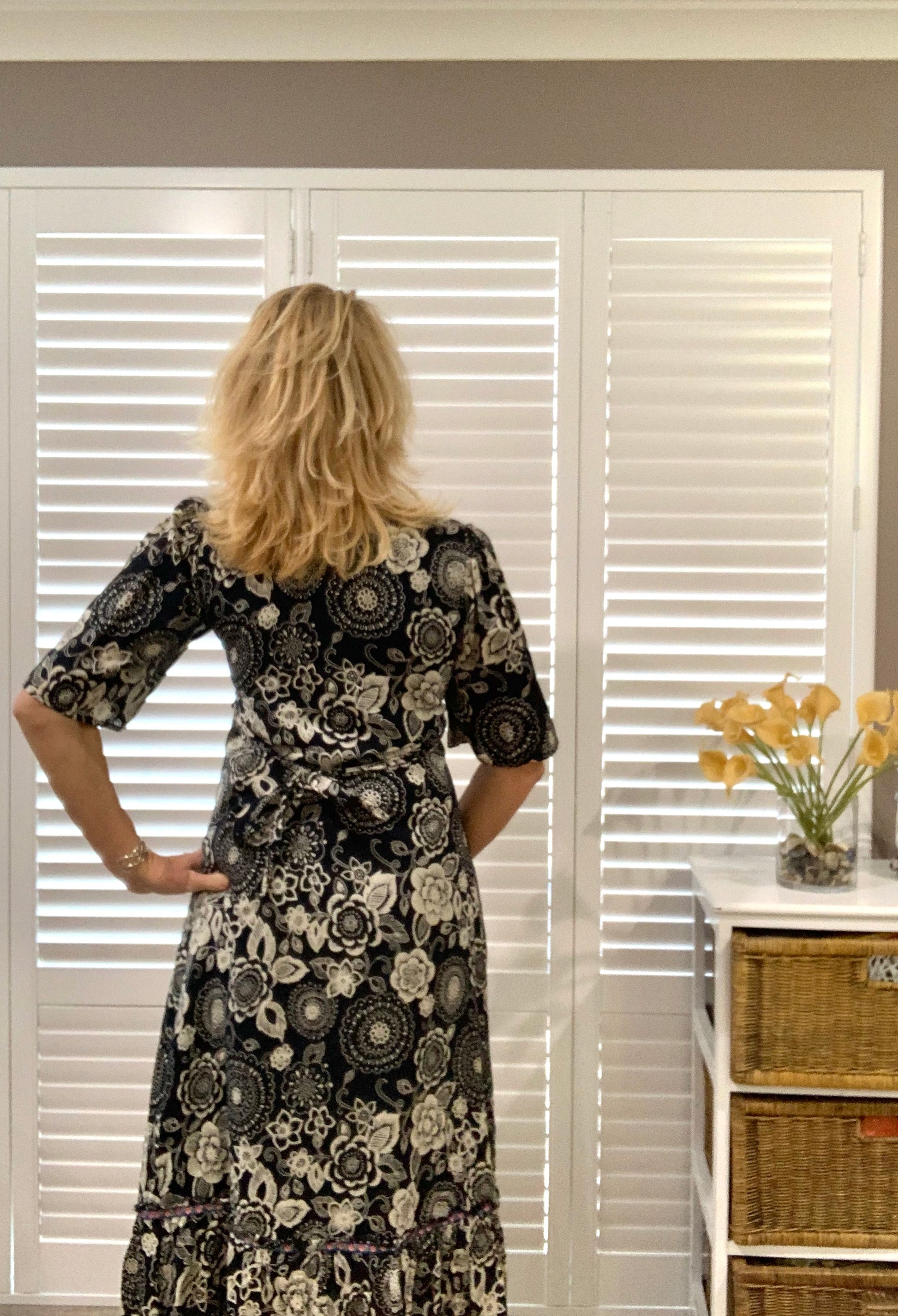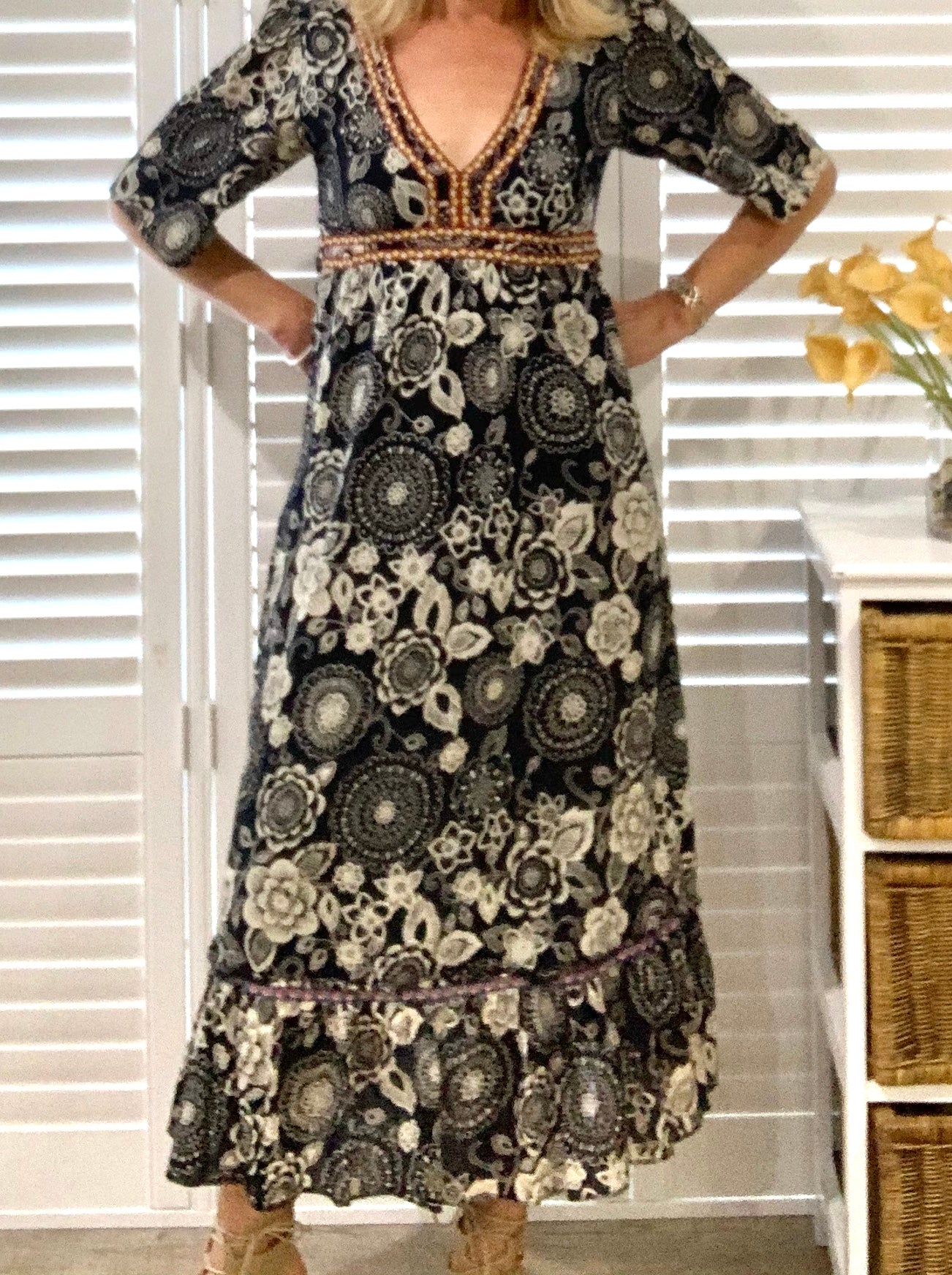 In 100% soft, natural cotton fabric in a pretty, black and white print, this beauty features a V neckline with gorgeous gold trim, 3/4 length sleeves, tie back waist and midi length skirt with ruffle hem. Bodice and skirt is fully lined.