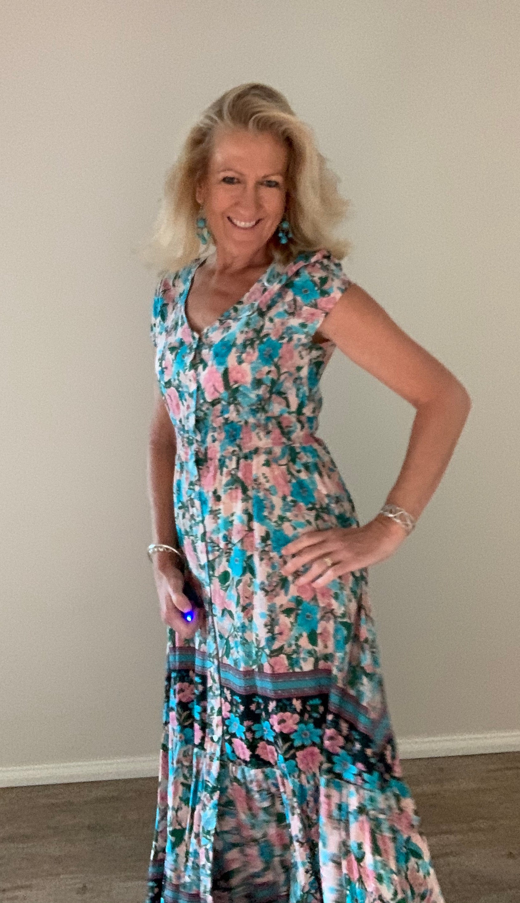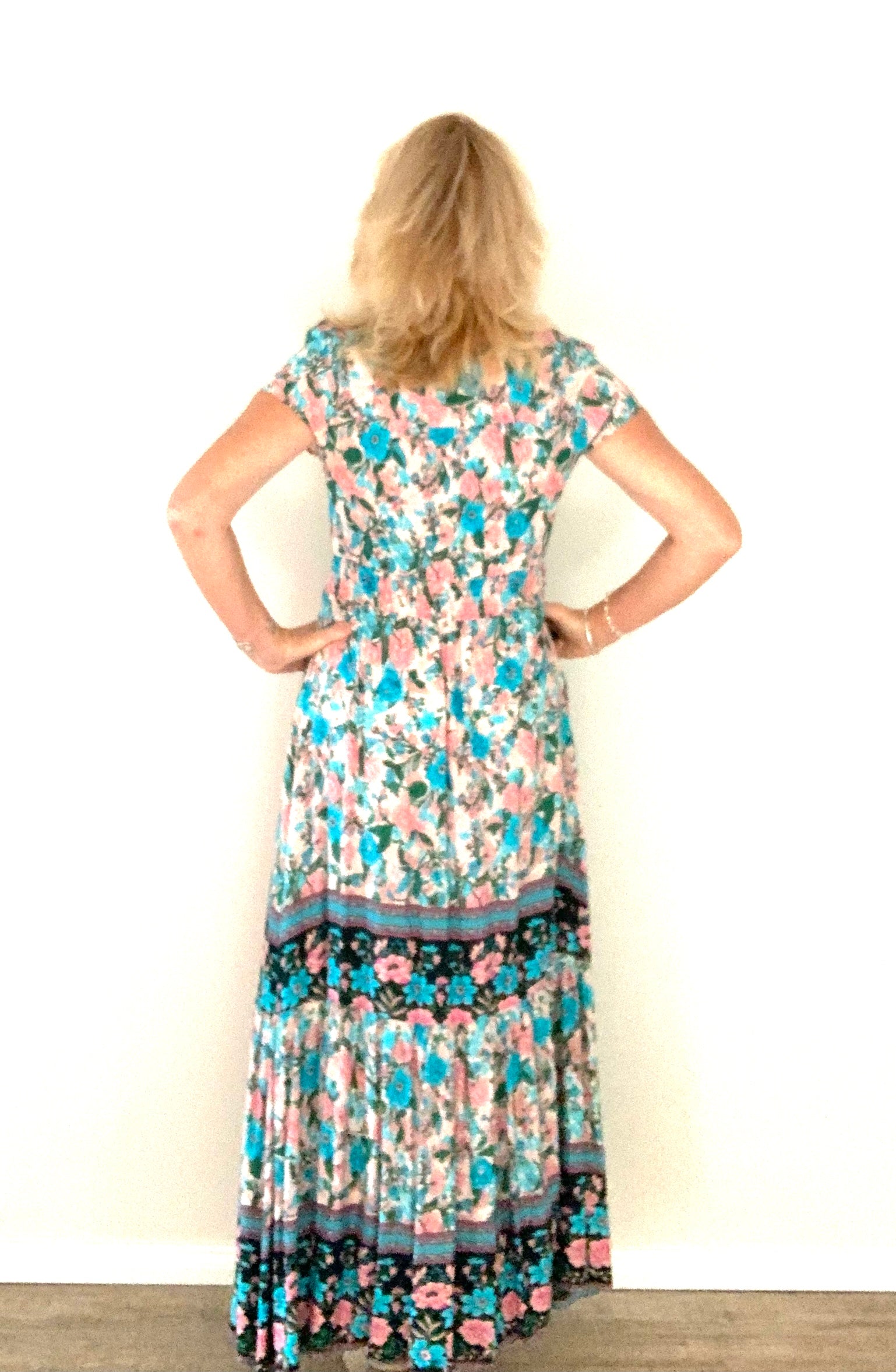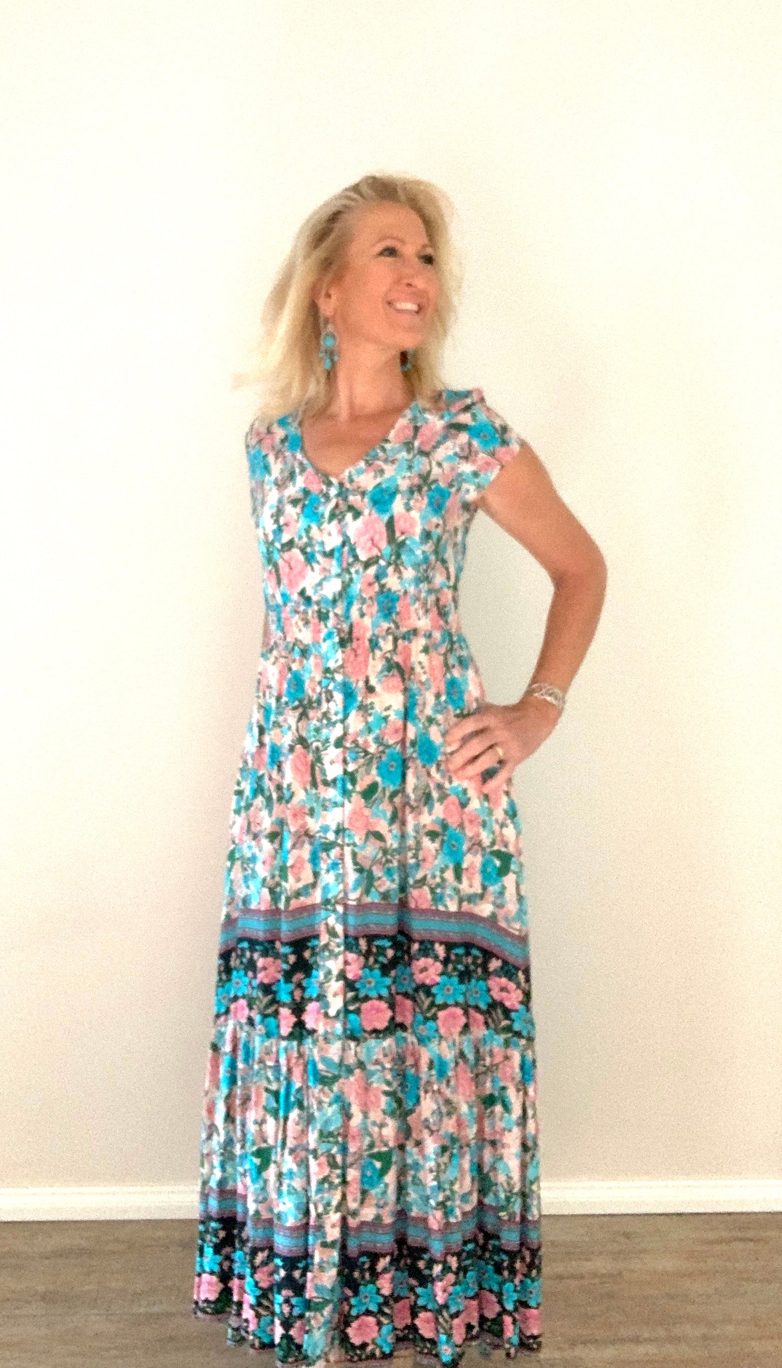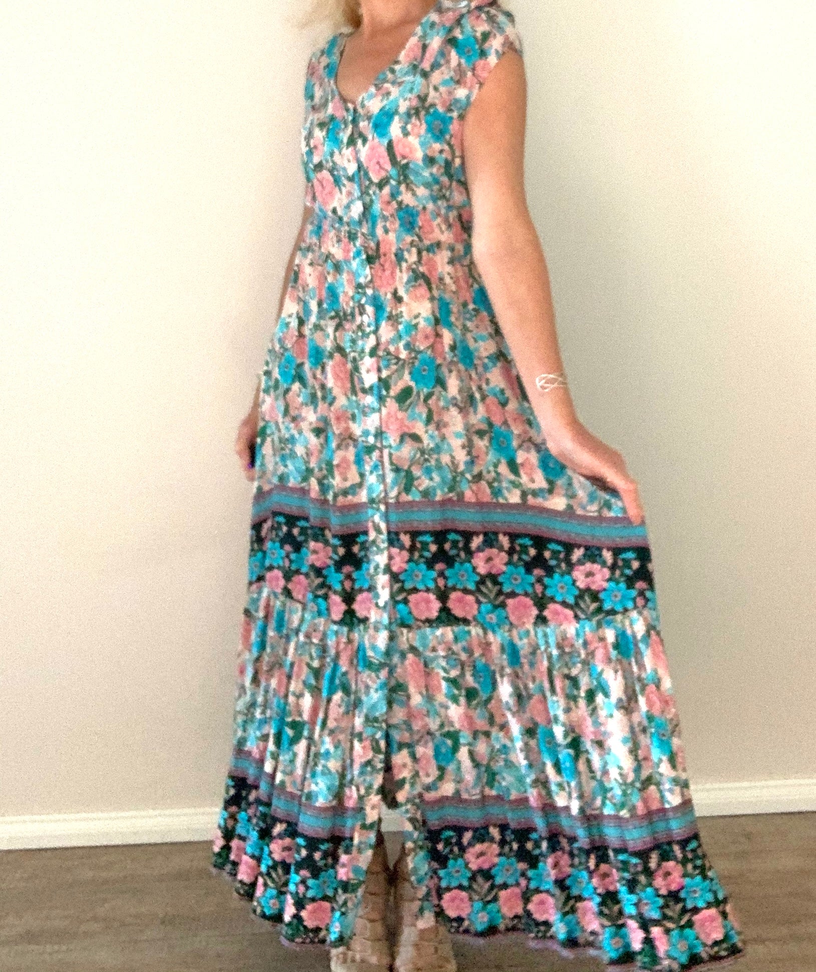 Gorgeous 'Hermetics' maxi dress from the Sanctum label. A beautiful, original, design by David Coen Australia (TM); this stunning dress features short sleeves, a button through bodice, comfy elasticised waist and full, floaty, maxi length skirt with a ruffle hem.